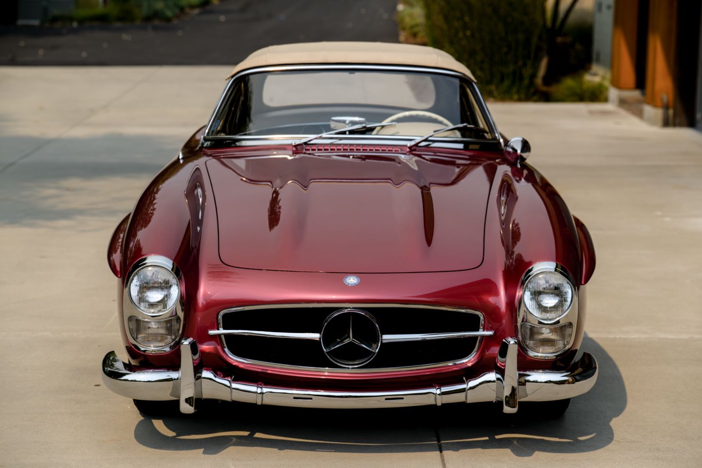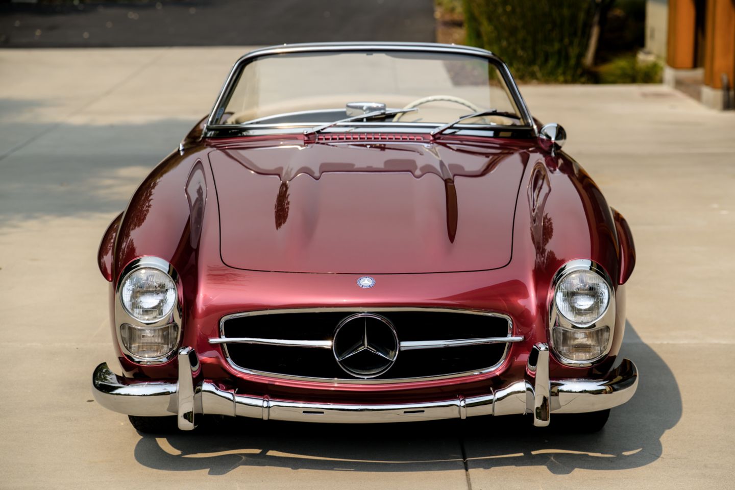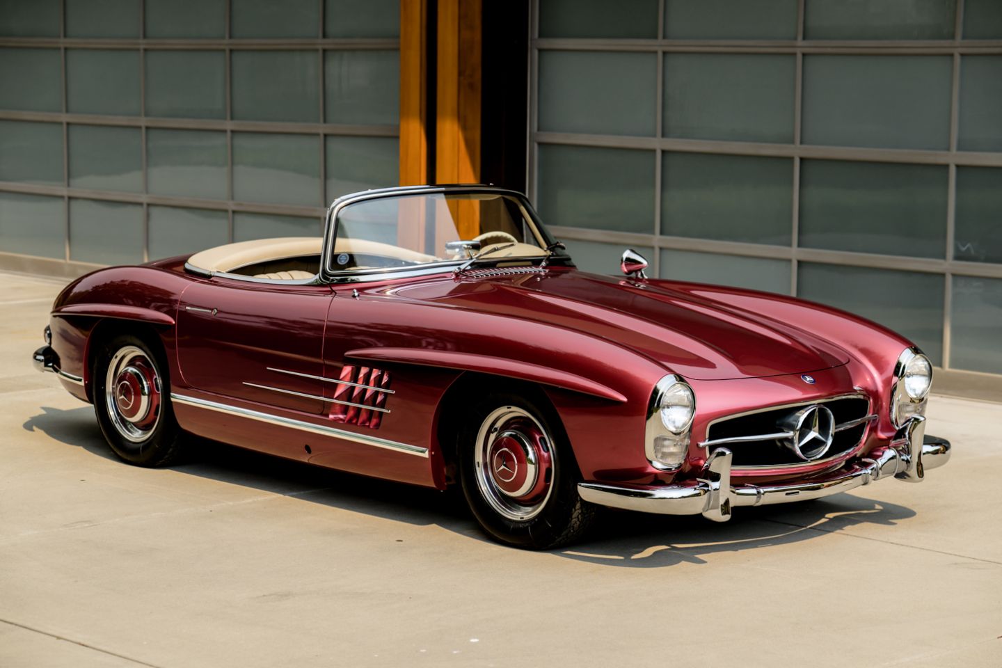 Exceptional to the core and restored by W198 marque expert Hjeltness Restoration in ‘body-off’ fashion, this matching numbers 300SL Roadster is a multiple-time Best of Show winner presenting today in the captivating Mercedes-Benz factory colors of 512 garnet metallic paint over 1060 cream leather. Having resided in the same family since 1988 and blessed with the pedigree of multi-year Gullwing Group Presidential ownership, this fastidiously-kept example comes with factory hard top, fitted matching luggage, polished wheels and only 52,426 original miles.