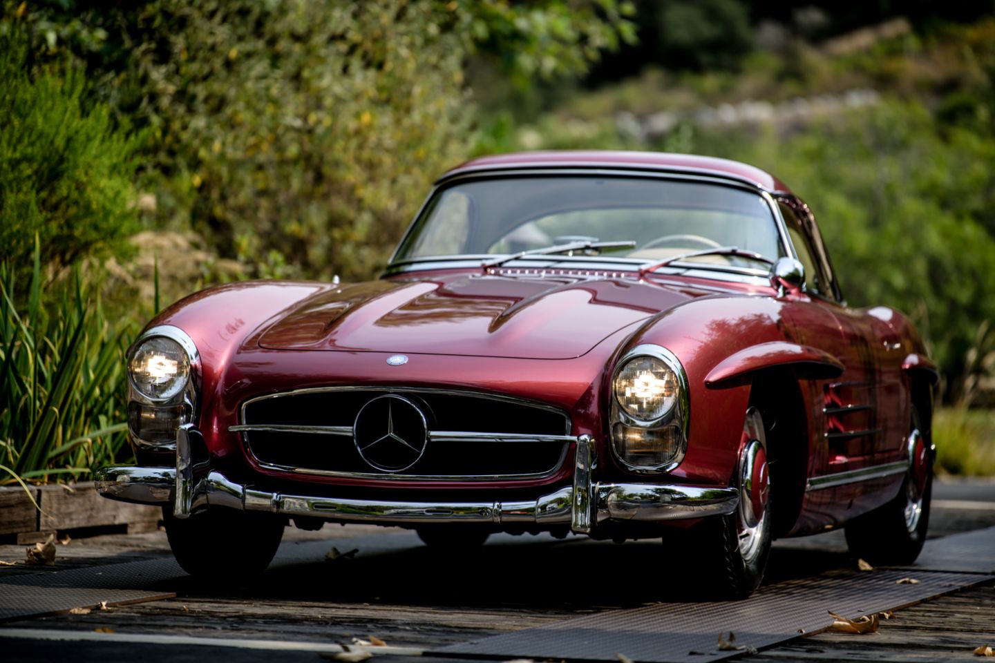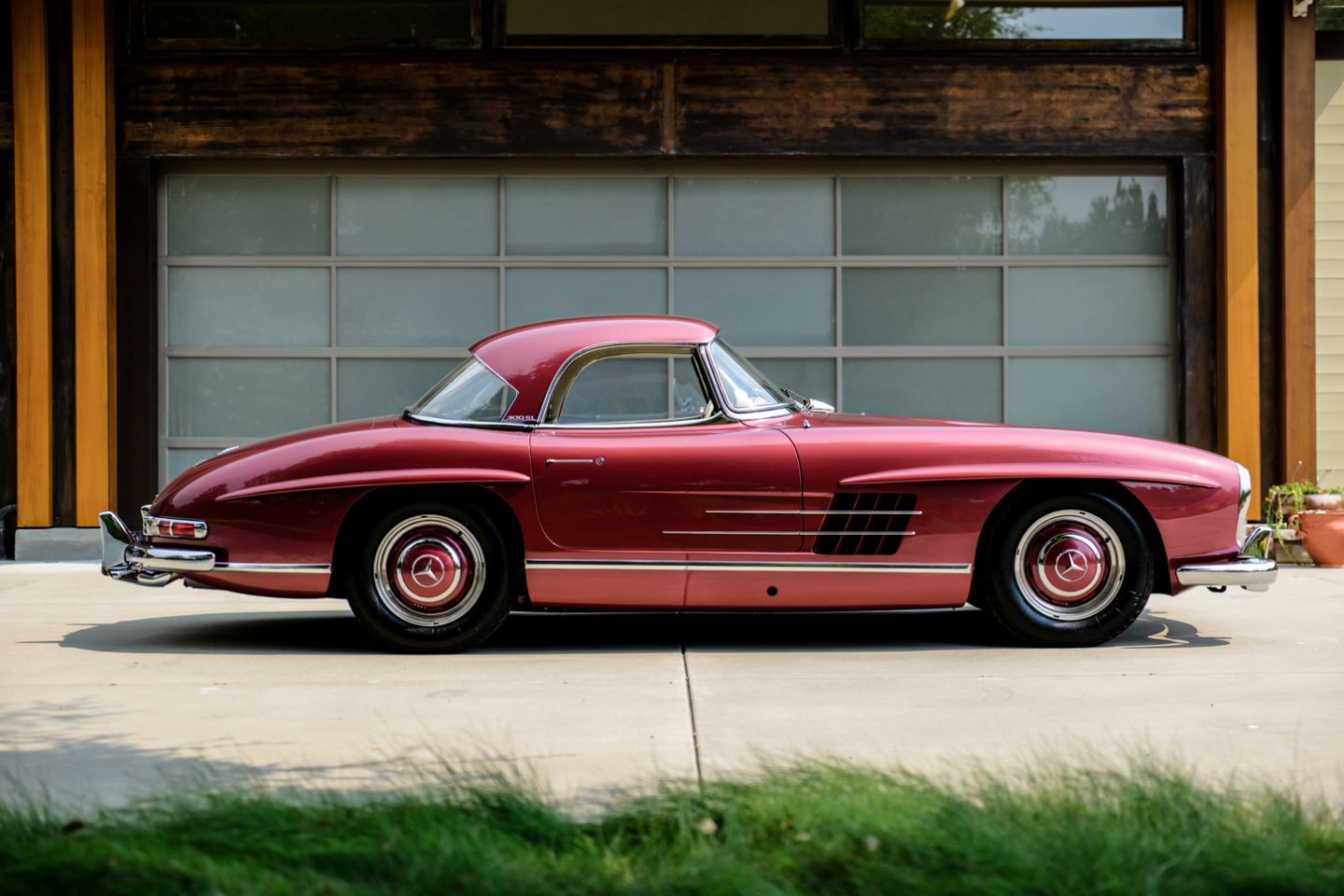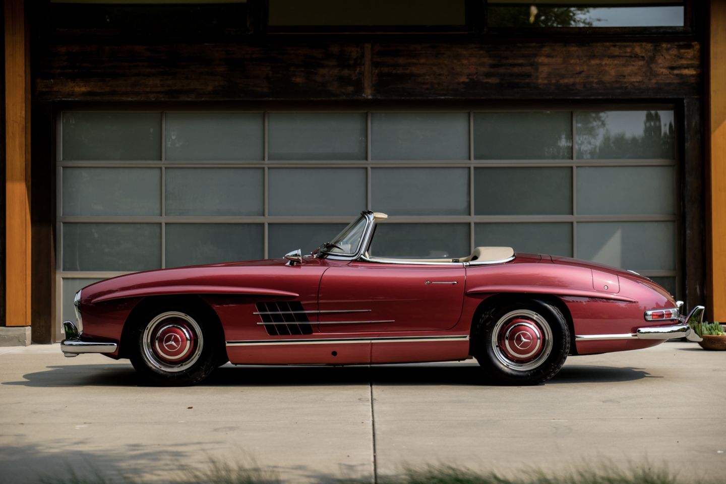 Exceptional to the core and restored by W198 marque expert Hjeltness Restoration in ‘body-off’ fashion, this matching numbers 300SL Roadster is a multiple-time Best of Show winner presenting today in the captivating Mercedes-Benz factory colors of 512 garnet metallic paint over 1060 cream leather. Having resided in the same family since 1988 and blessed with the pedigree of multi-year Gullwing Group Presidential ownership, this fastidiously-kept example comes with factory hard top, fitted matching luggage, polished wheels and only 52,426 original miles.