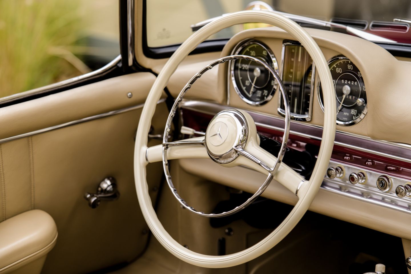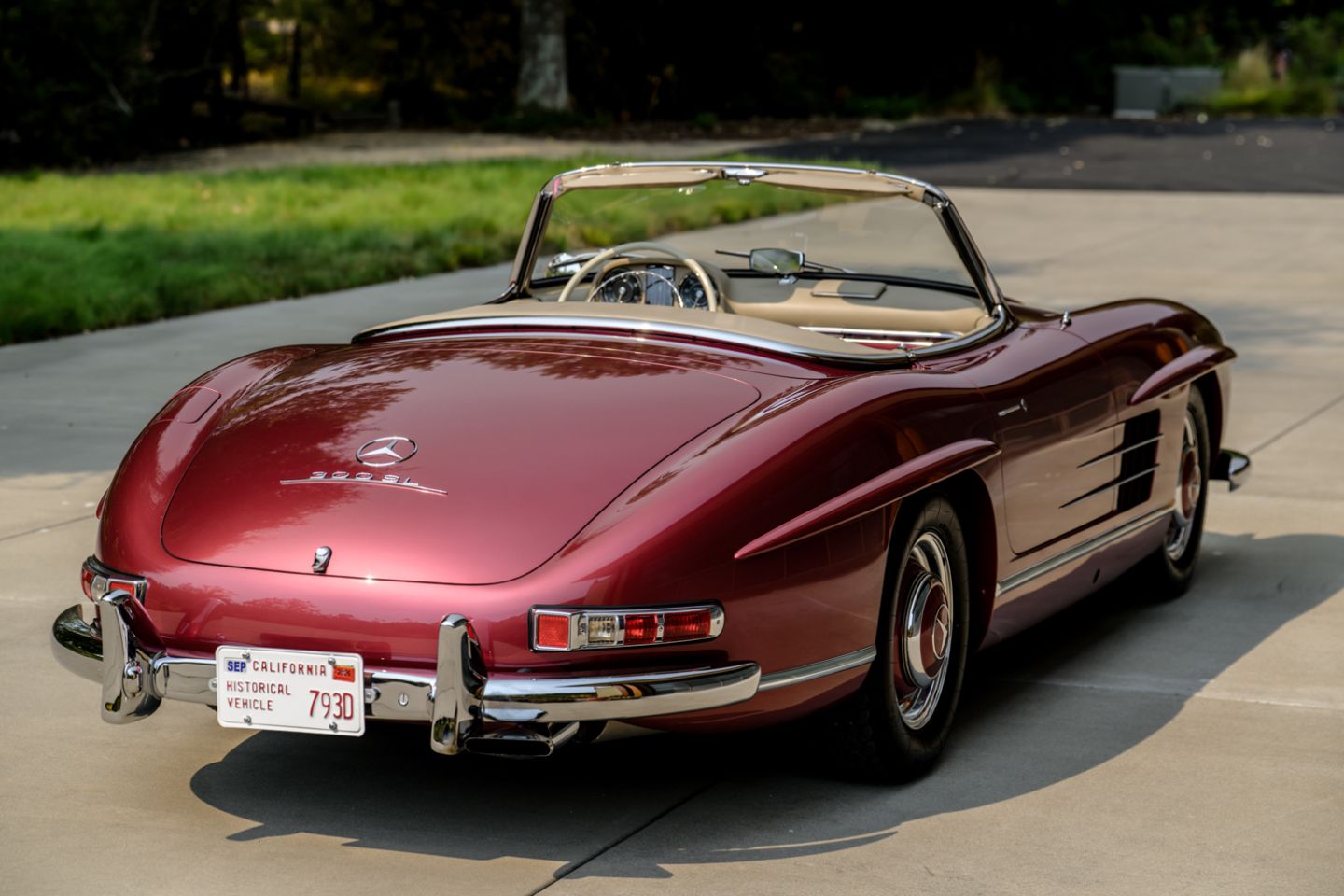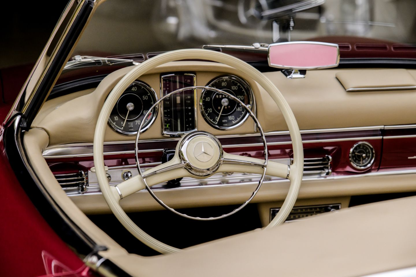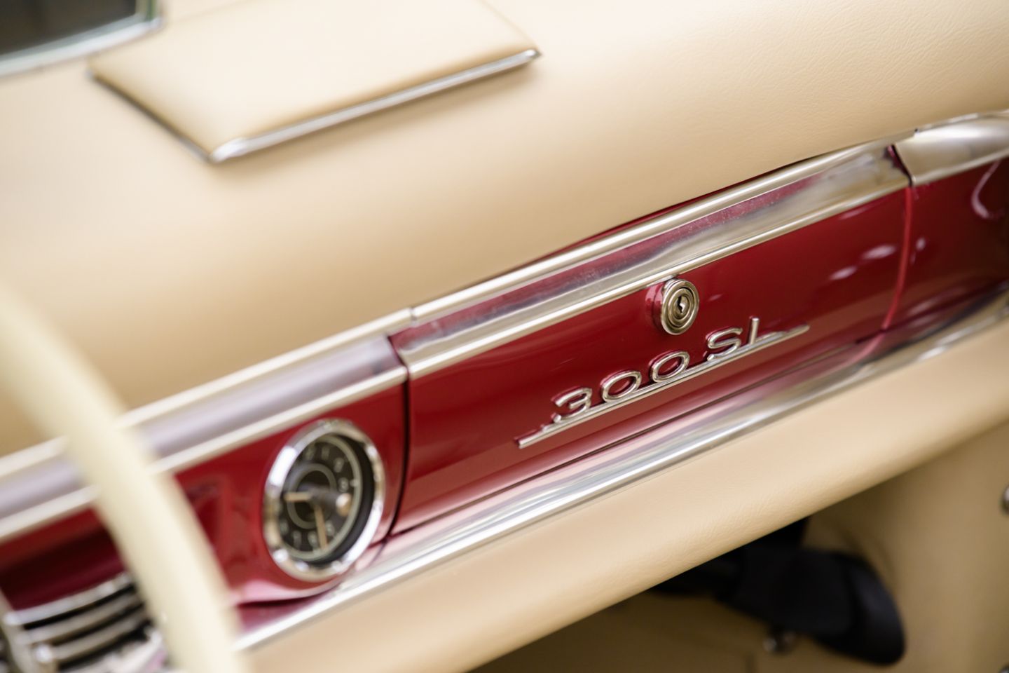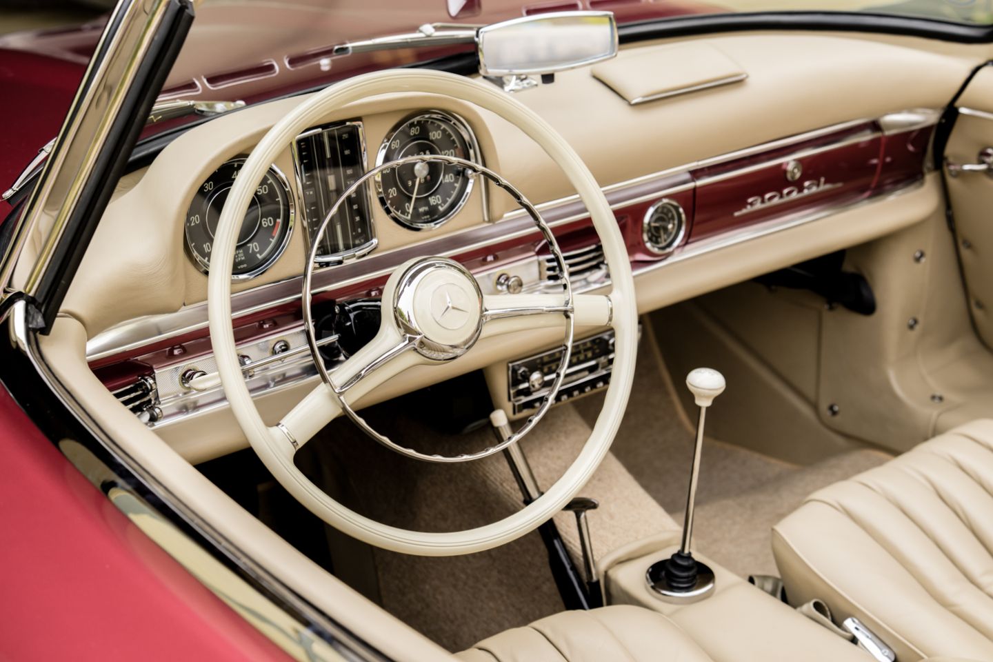 The 300SL is finished today as completed in 1993 in a dazzling, deep strawberry metallic paint color known as ‘Garnet’ in the Mercedes color catalog, a shade which is perfectly set off by sumptuous 1060 crème leather paired to beige carpets with a beautifully matched German canvas soft top. The Roadster’s original factory hard top is finished in Garnet and has been fitted expertly to the car, while the wheels have been polished for an extra level of panache with body color painted hubcaps. Fitted matching luggage for the trunk space rounds out the one-of-a-kind look of chassis 8500158 and cements it as one of the absolute prettiest 300SLs one will ever come across.