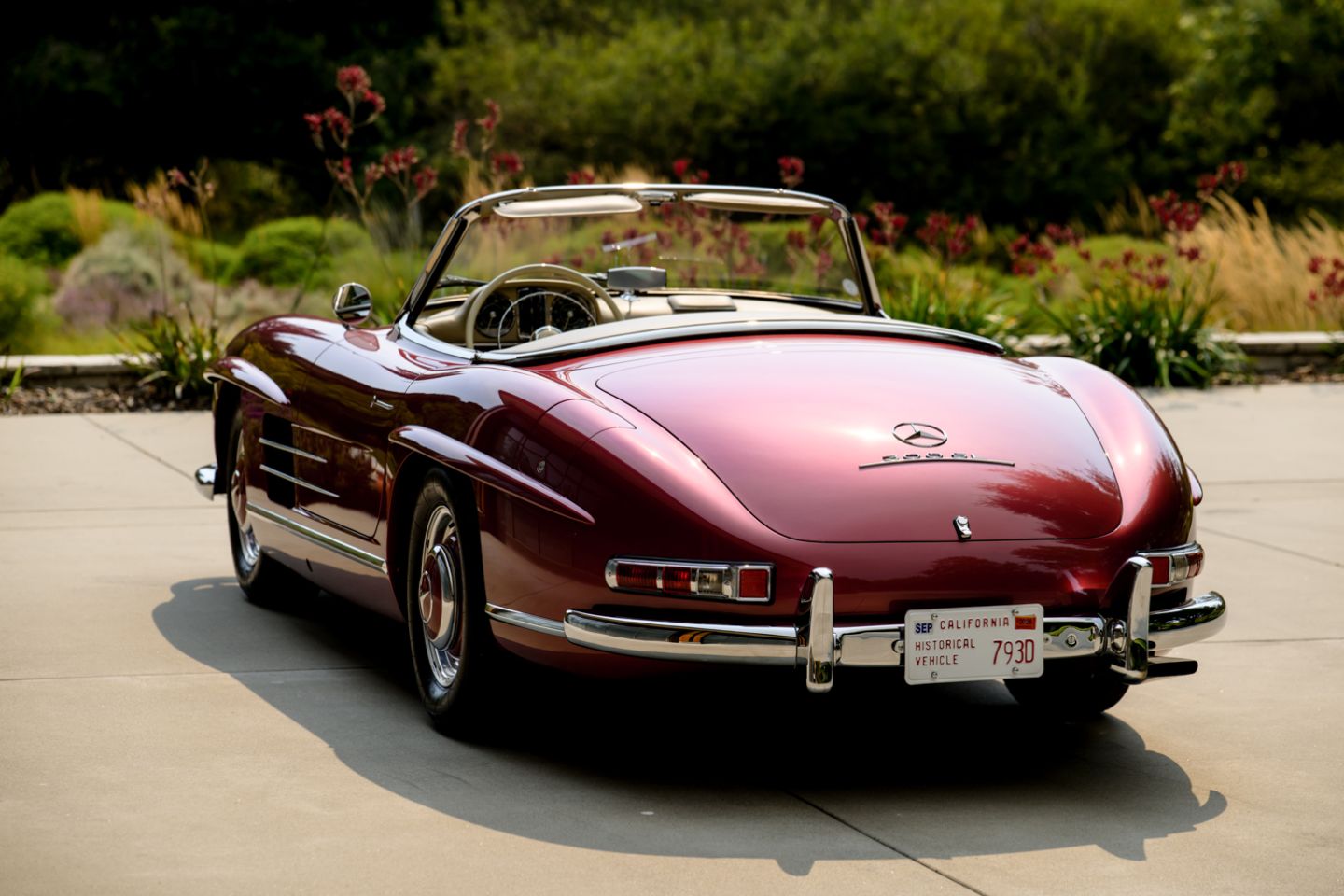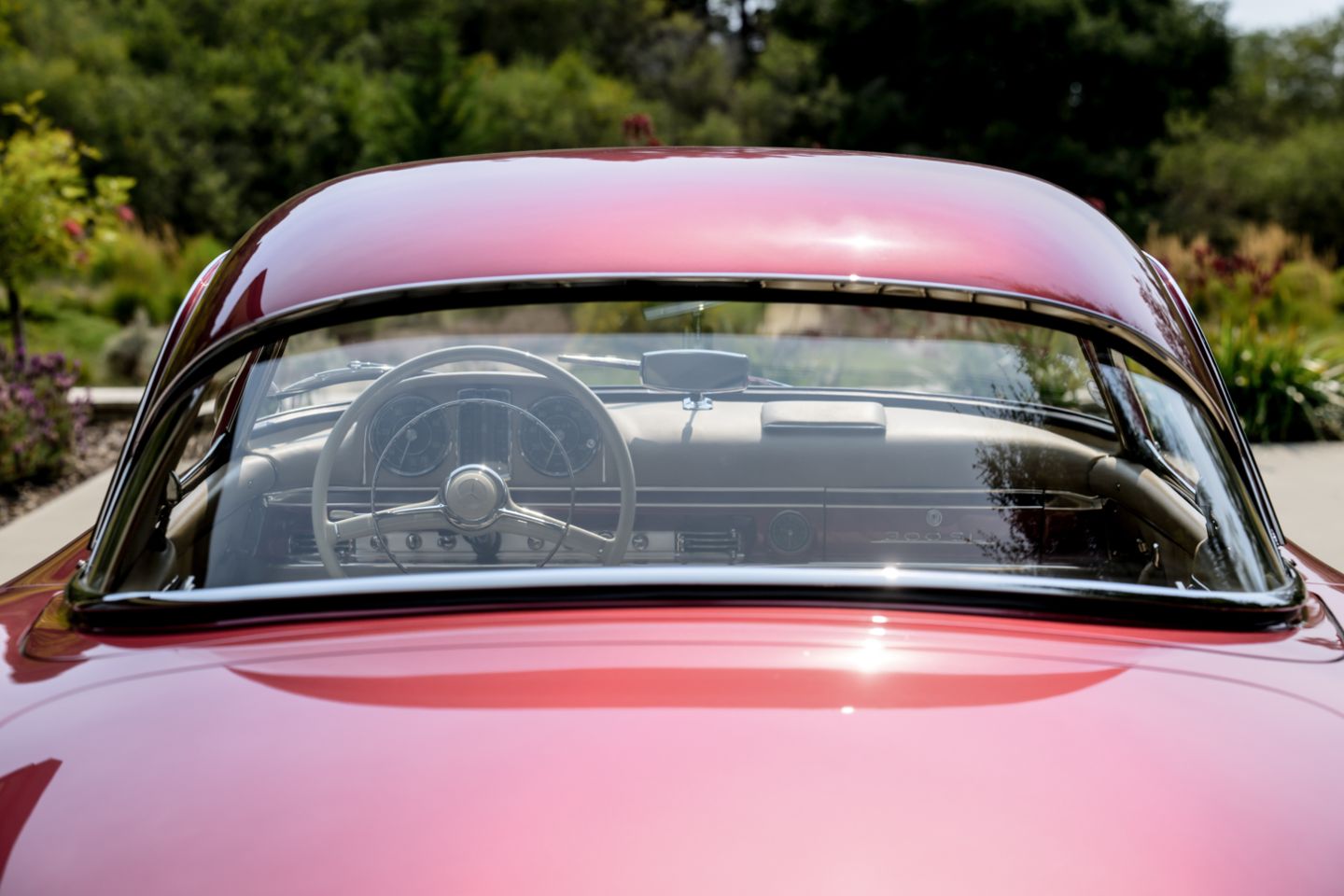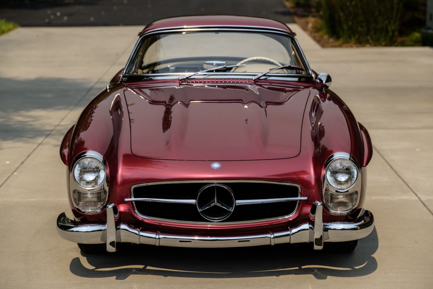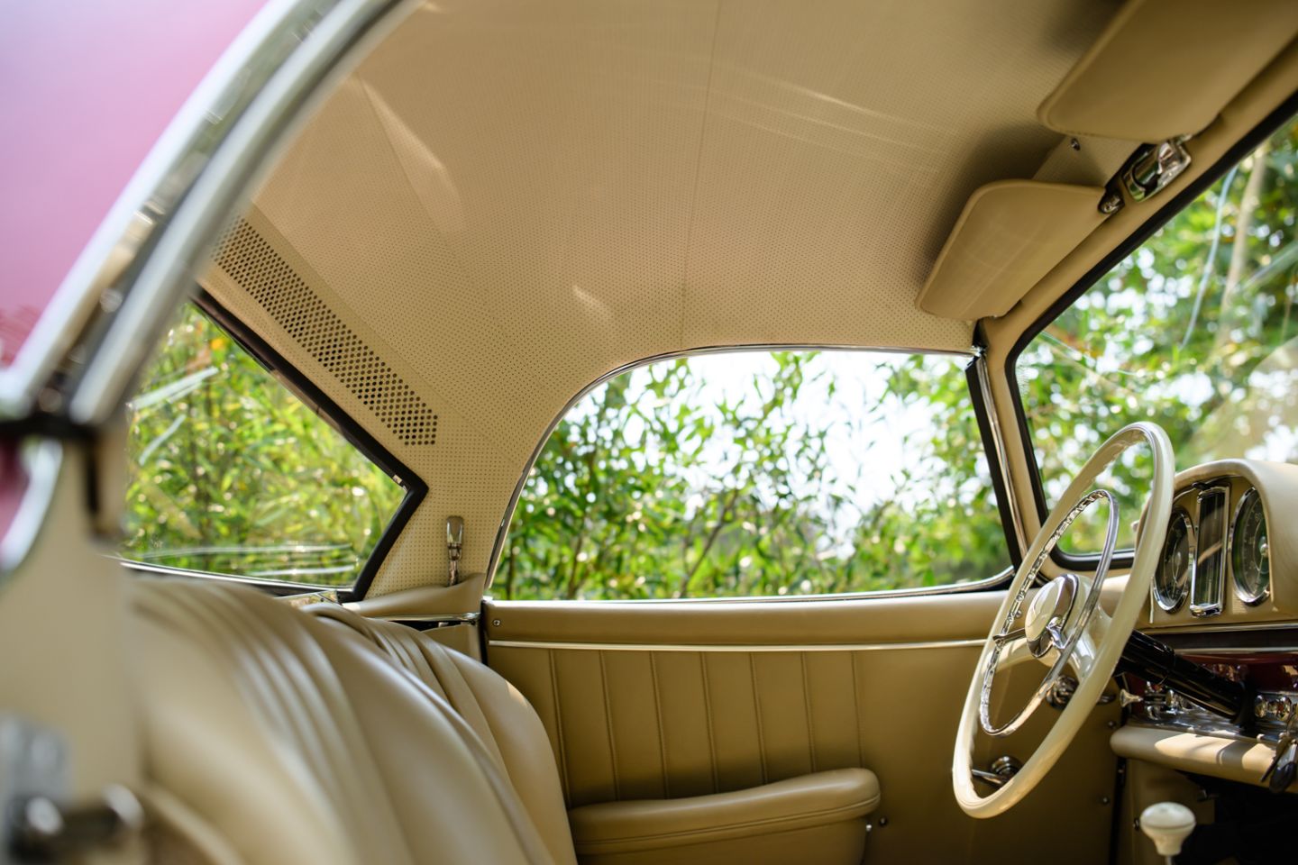 The 300SL is finished today as completed in 1993 in a dazzling, deep strawberry metallic paint color known as ‘Garnet’ in the Mercedes color catalog, a shade which is perfectly set off by sumptuous 1060 crème leather paired to beige carpets with a beautifully matched German canvas soft top. The Roadster’s original factory hard top is finished in Garnet and has been fitted expertly to the car, while the wheels have been polished for an extra level of panache with body color painted hubcaps. Fitted matching luggage for the trunk space rounds out the one-of-a-kind look of chassis 8500158 and cements it as one of the absolute prettiest 300SLs one will ever come across.