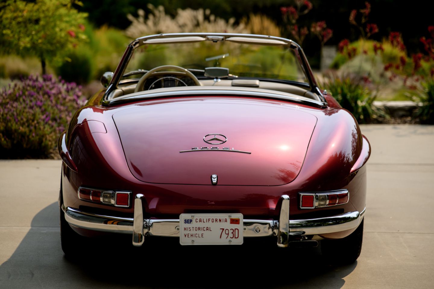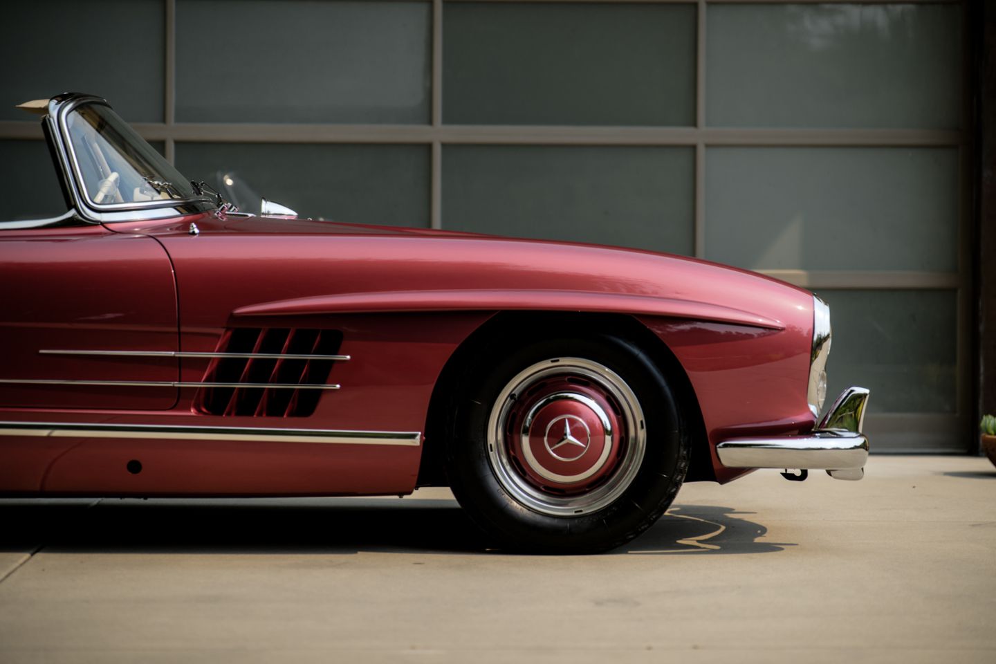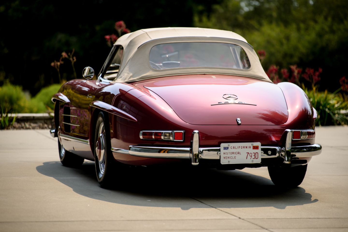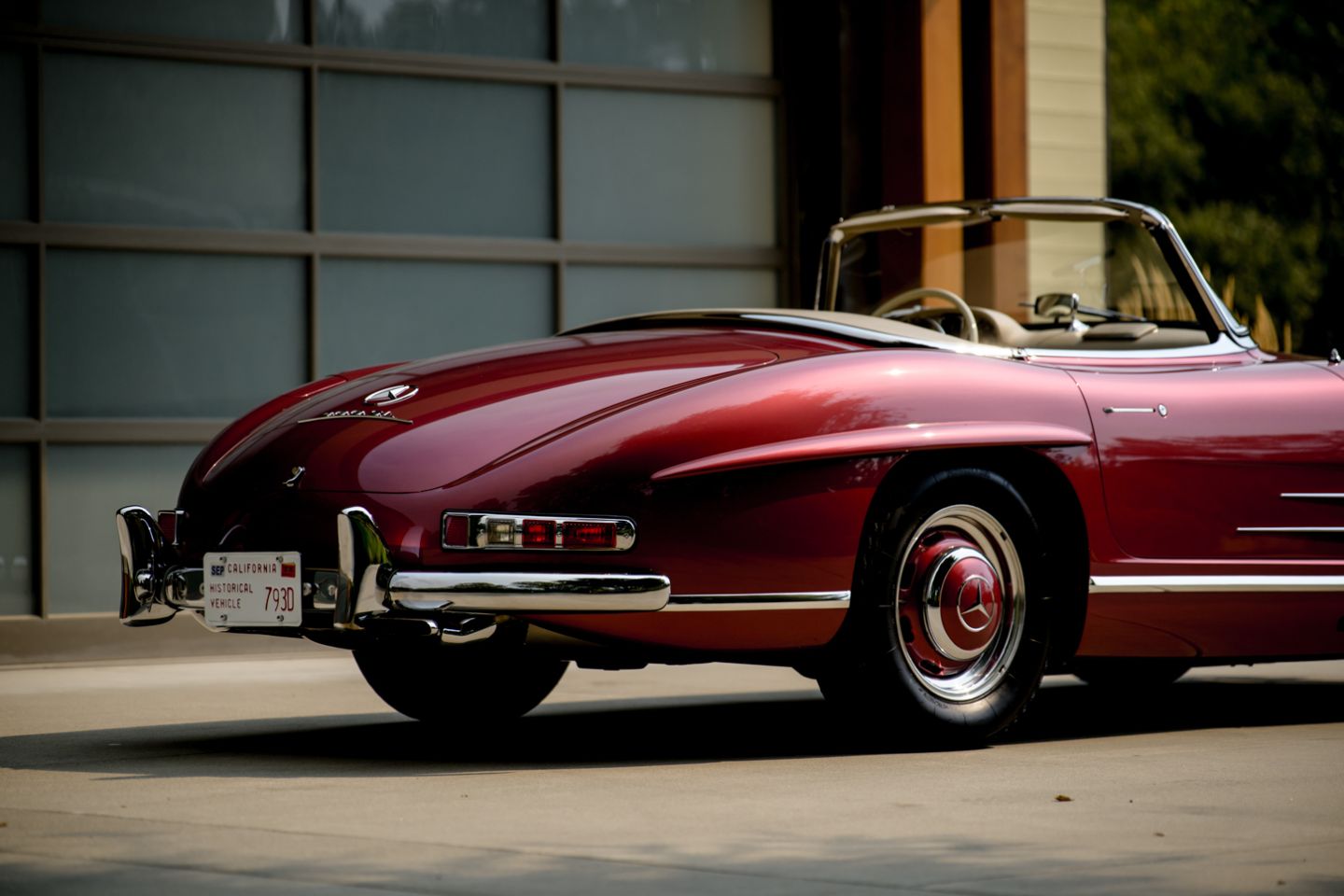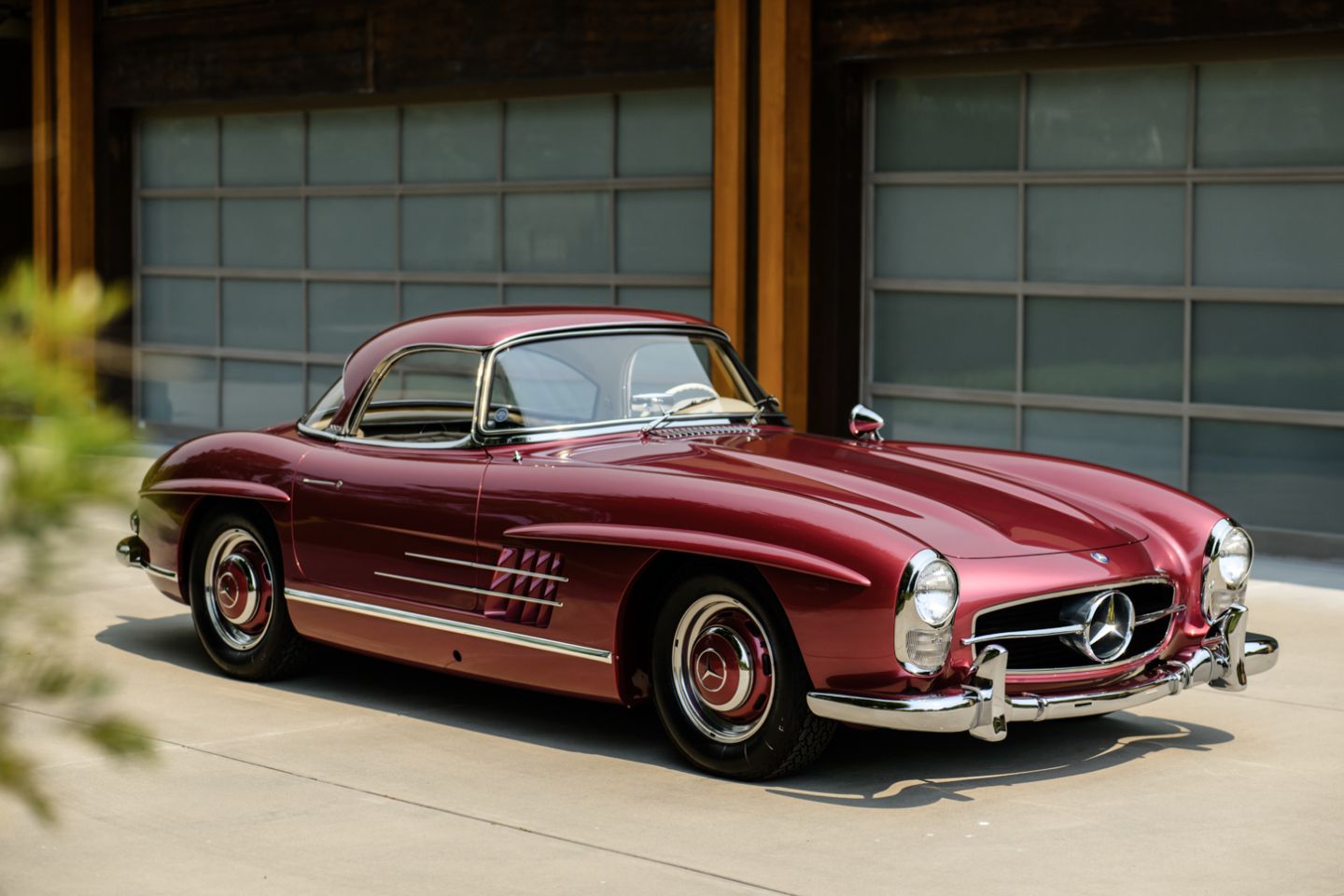 The 300SL is finished today as completed in 1993 in a dazzling, deep strawberry metallic paint color known as ‘Garnet’ in the Mercedes color catalog, a shade which is perfectly set off by sumptuous 1060 crème leather paired to beige carpets with a beautifully matched German canvas soft top. The Roadster’s original factory hard top is finished in Garnet and has been fitted expertly to the car, while the wheels have been polished for an extra level of panache with body color painted hubcaps. Fitted matching luggage for the trunk space rounds out the one-of-a-kind look of chassis 8500158 and cements it as one of the absolute prettiest 300SLs one will ever come across.