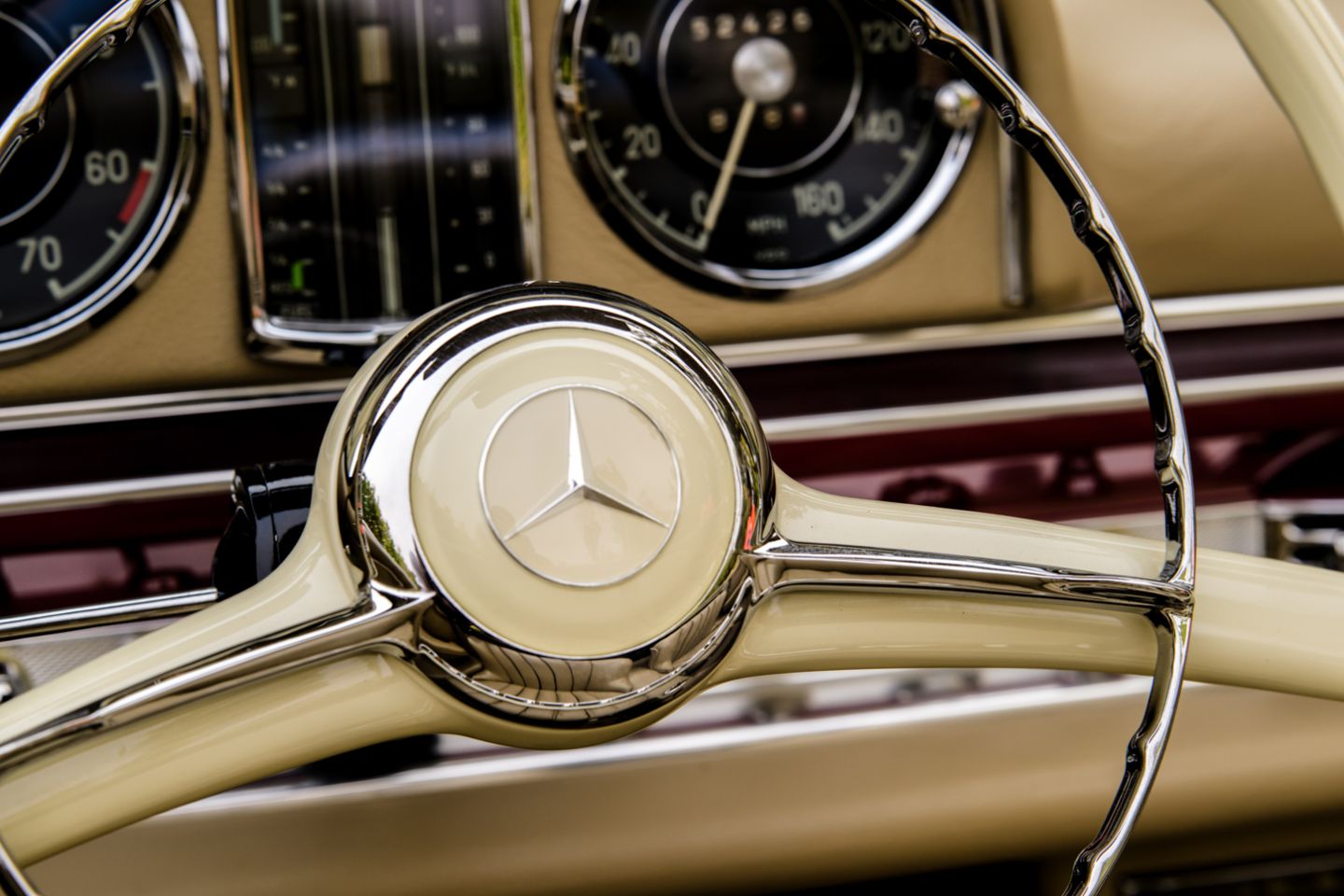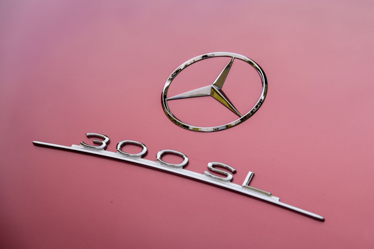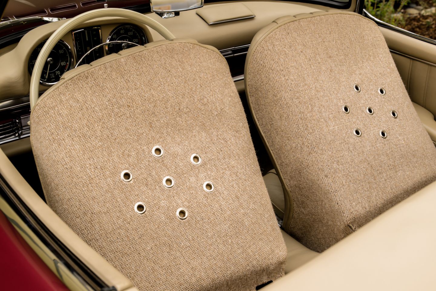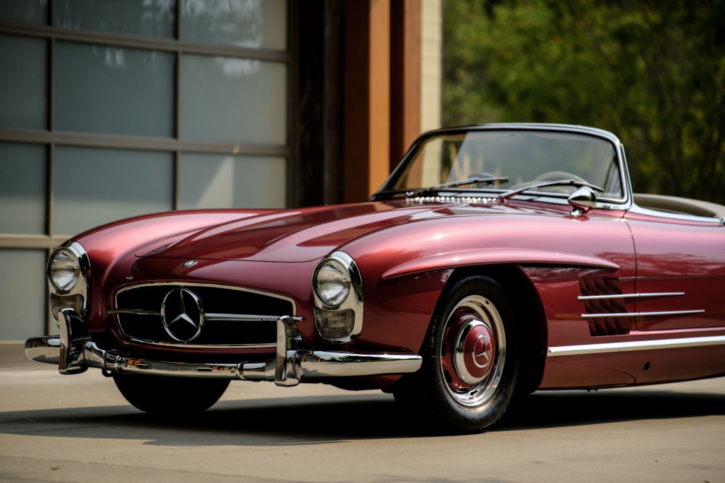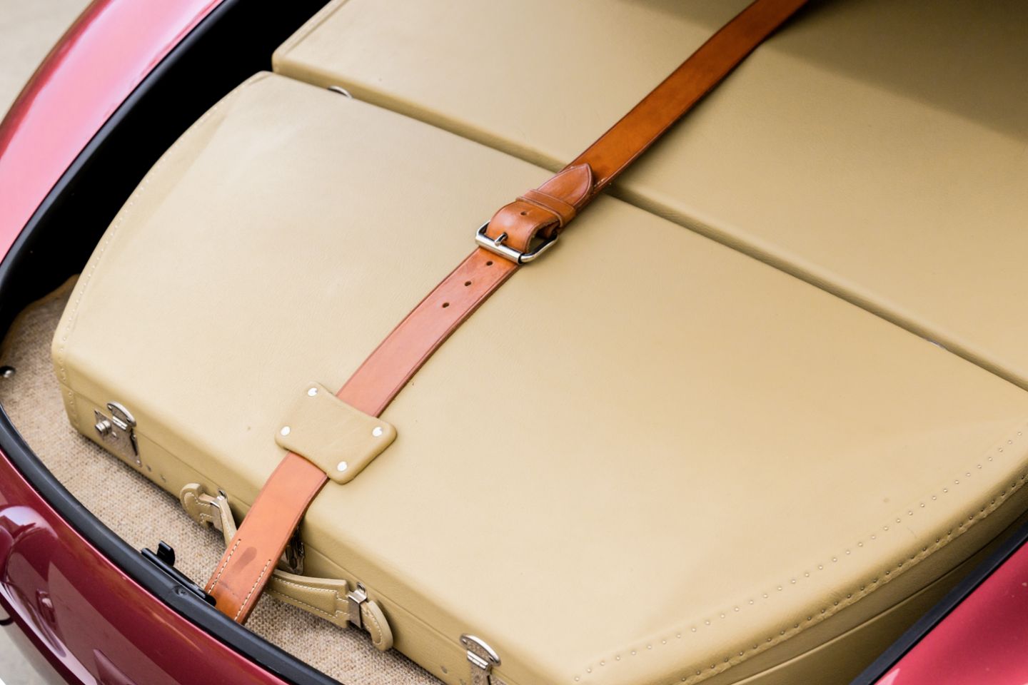 The 300SL is finished today as completed in 1993 in a dazzling, deep strawberry metallic paint color known as ‘Garnet’ in the Mercedes color catalog, a shade which is perfectly set off by sumptuous 1060 crème leather paired to beige carpets with a beautifully matched German canvas soft top. The Roadster’s original factory hard top is finished in Garnet and has been fitted expertly to the car, while the wheels have been polished for an extra level of panache with body color painted hubcaps. Fitted matching luggage for the trunk space rounds out the one-of-a-kind look of chassis 8500158 and cements it as one of the absolute prettiest 300SLs one will ever come across.