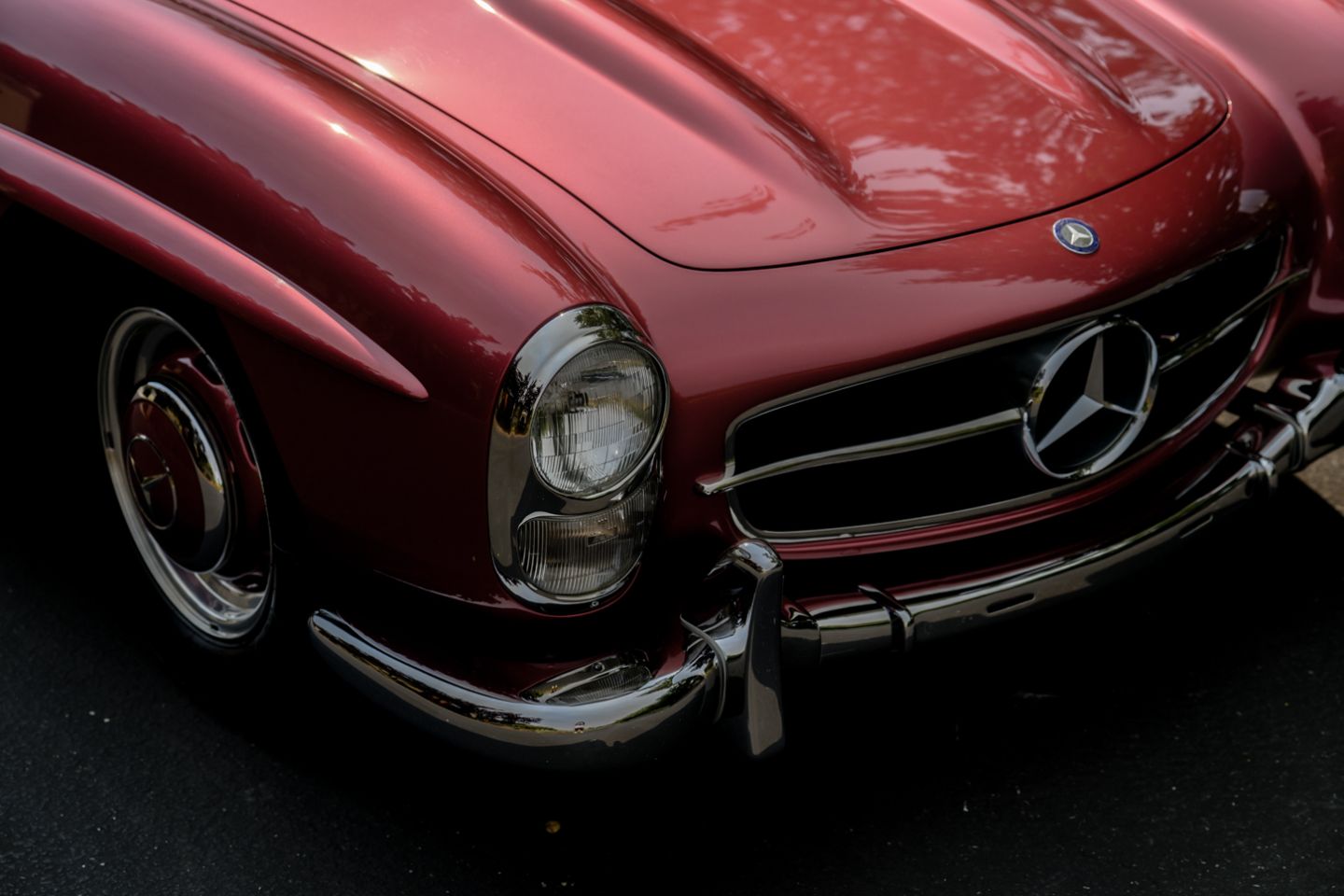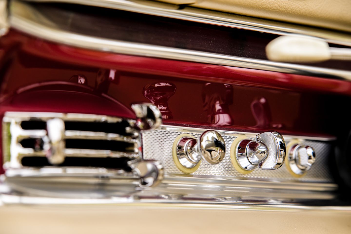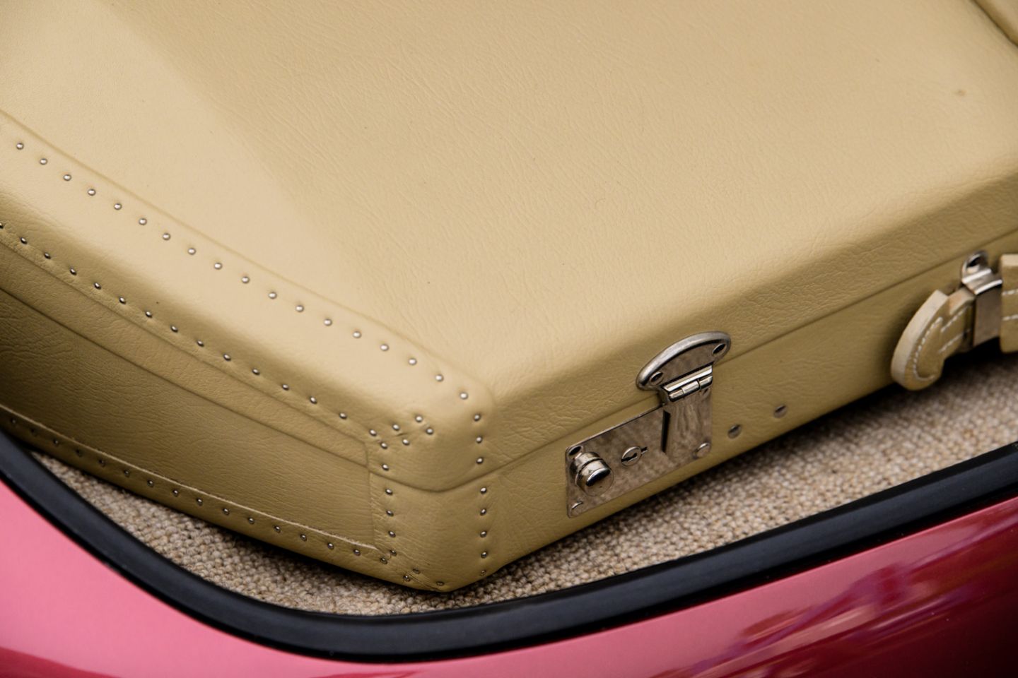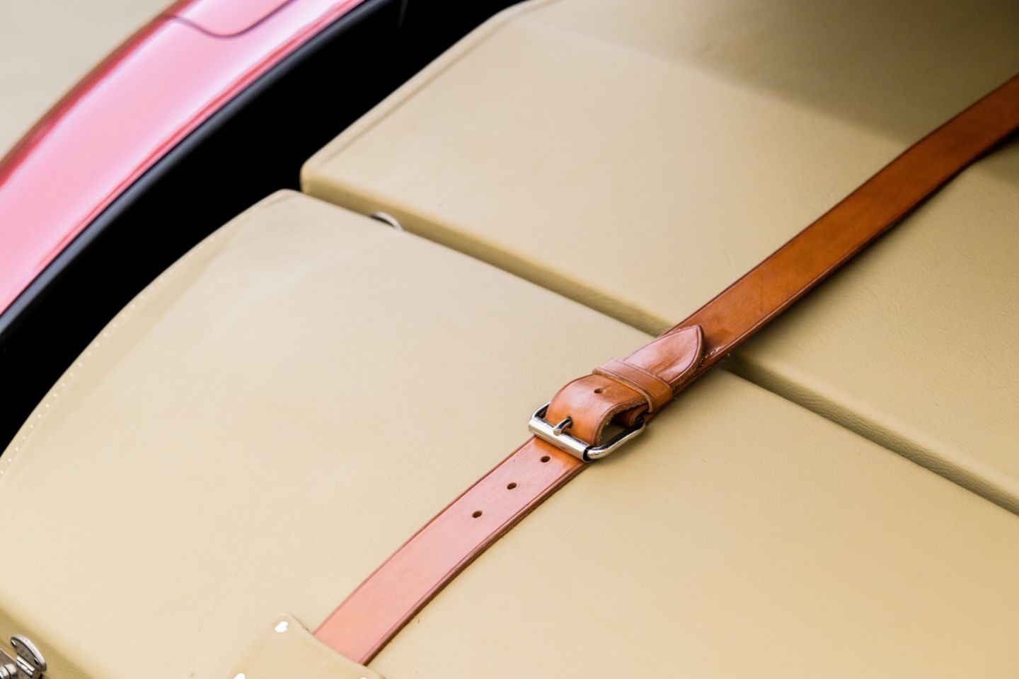 The 300SL is finished today as completed in 1993 in a dazzling, deep strawberry metallic paint color known as ‘Garnet’ in the Mercedes color catalog, a shade which is perfectly set off by sumptuous 1060 crème leather paired to beige carpets with a beautifully matched German canvas soft top. The Roadster’s original factory hard top is finished in Garnet and has been fitted expertly to the car, while the wheels have been polished for an extra level of panache with body color painted hubcaps. Fitted matching luggage for the trunk space rounds out the one-of-a-kind look of chassis 8500158 and cements it as one of the absolute prettiest 300SLs one will ever come across.