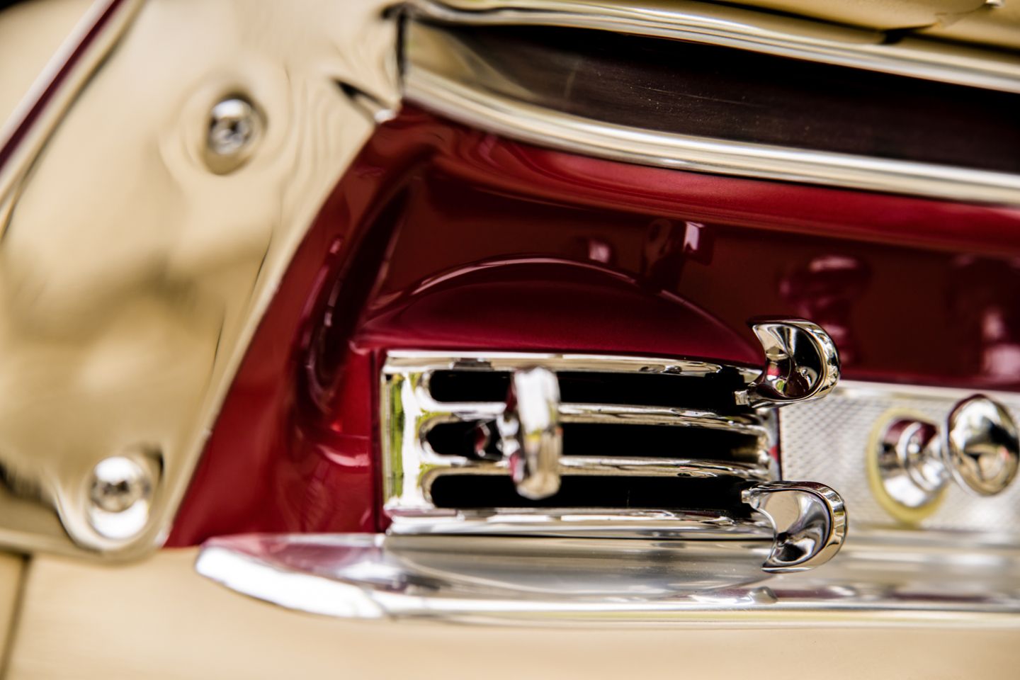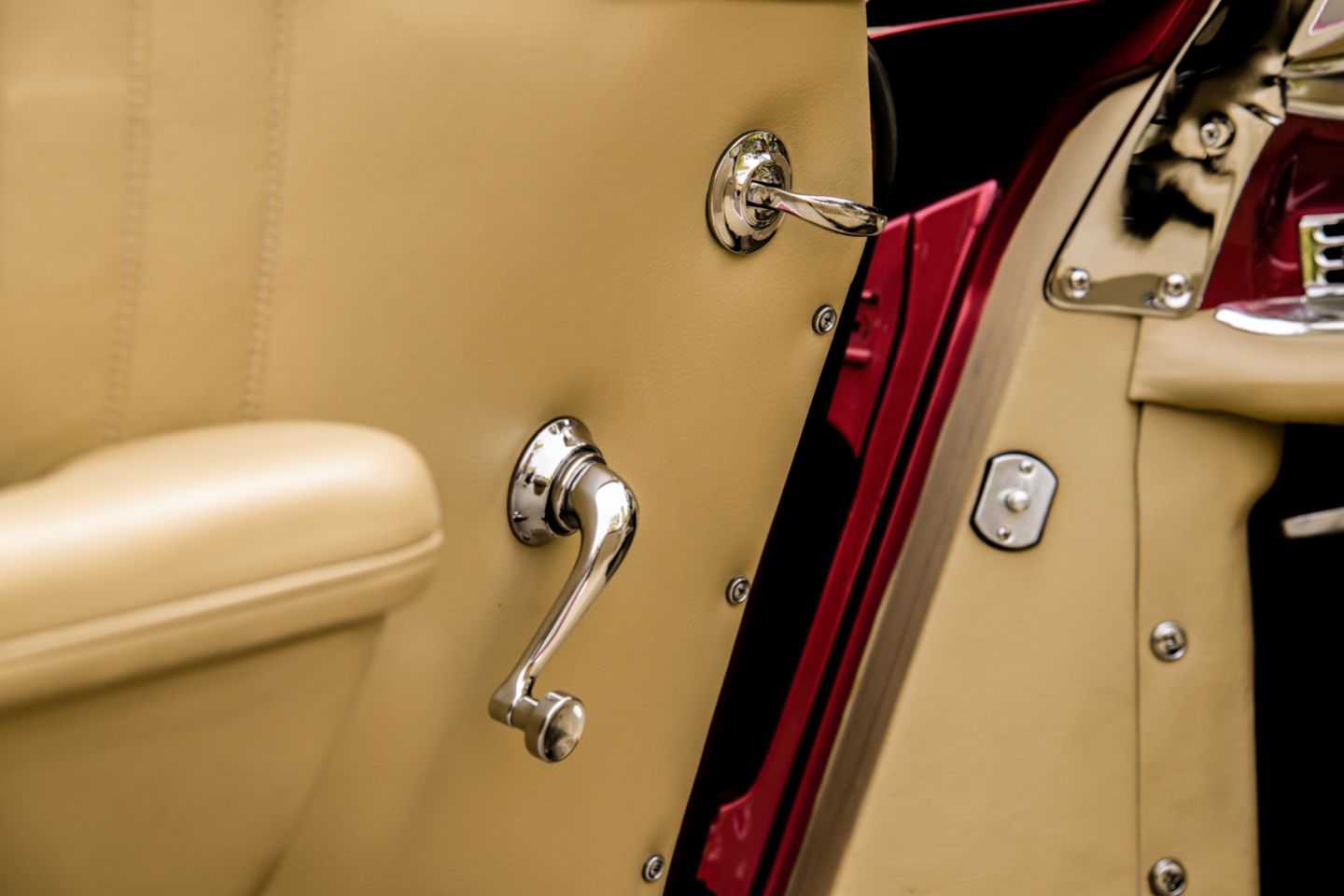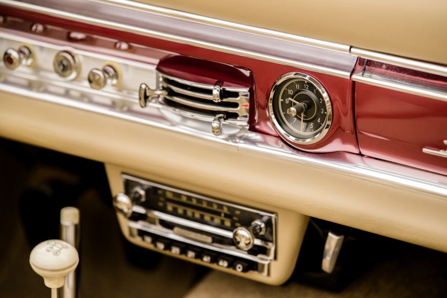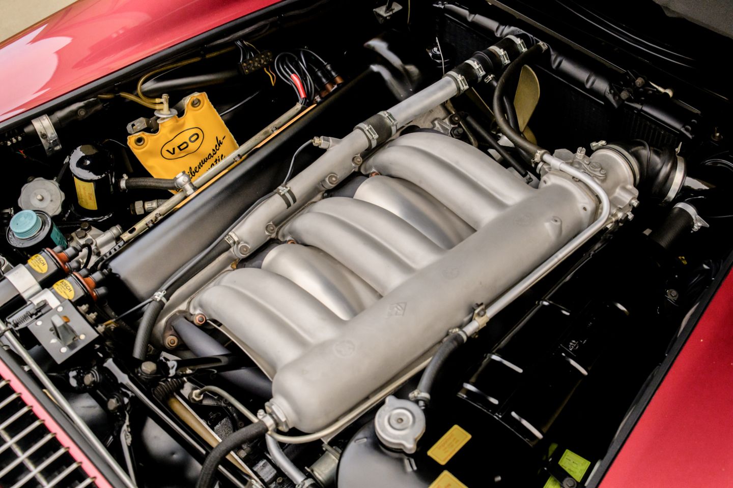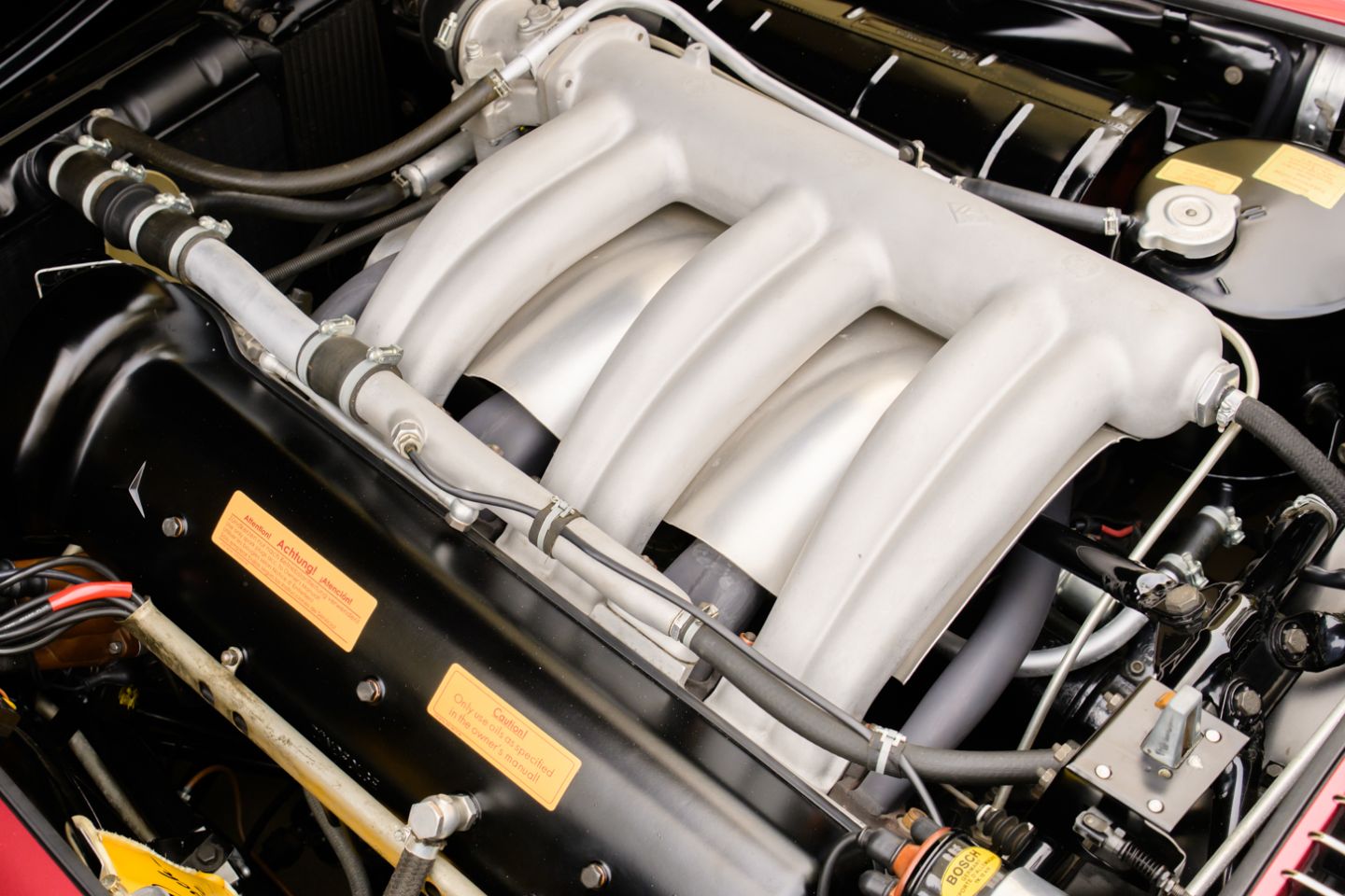 The 300SL is finished today as completed in 1993 in a dazzling, deep strawberry metallic paint color known as ‘Garnet’ in the Mercedes color catalog, a shade which is perfectly set off by sumptuous 1060 crème leather paired to beige carpets with a beautifully matched German canvas soft top. The Roadster’s original factory hard top is finished in Garnet and has been fitted expertly to the car, while the wheels have been polished for an extra level of panache with body color painted hubcaps. Fitted matching luggage for the trunk space rounds out the one-of-a-kind look of chassis 8500158 and cements it as one of the absolute prettiest 300SLs one will ever come across.
