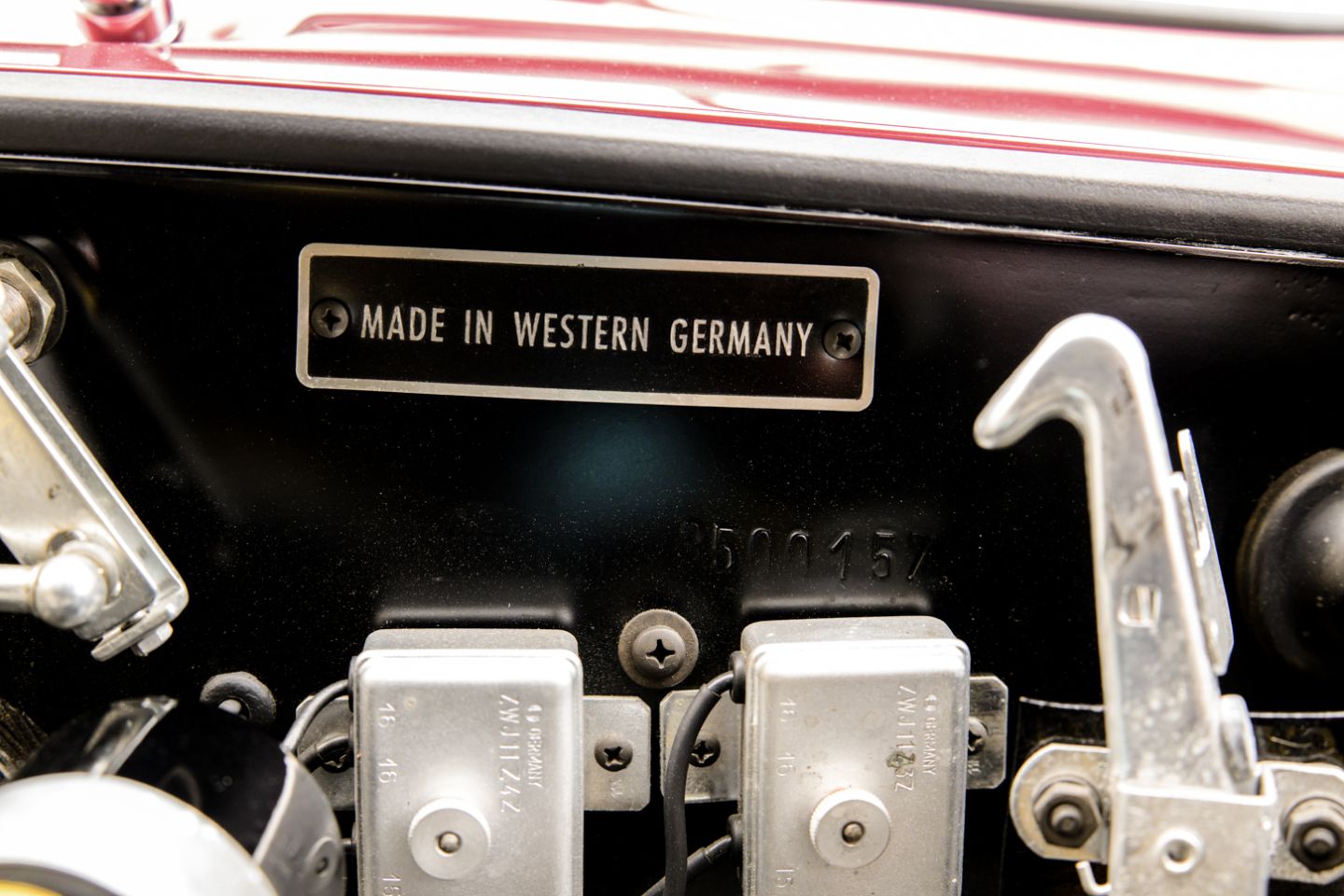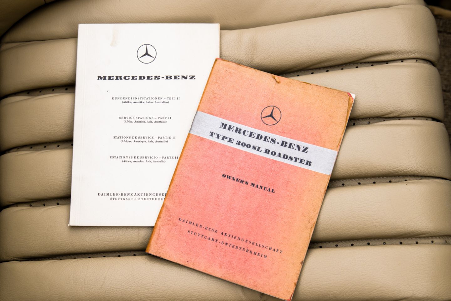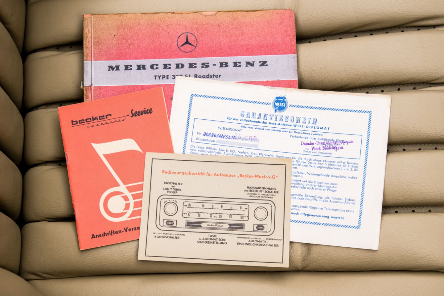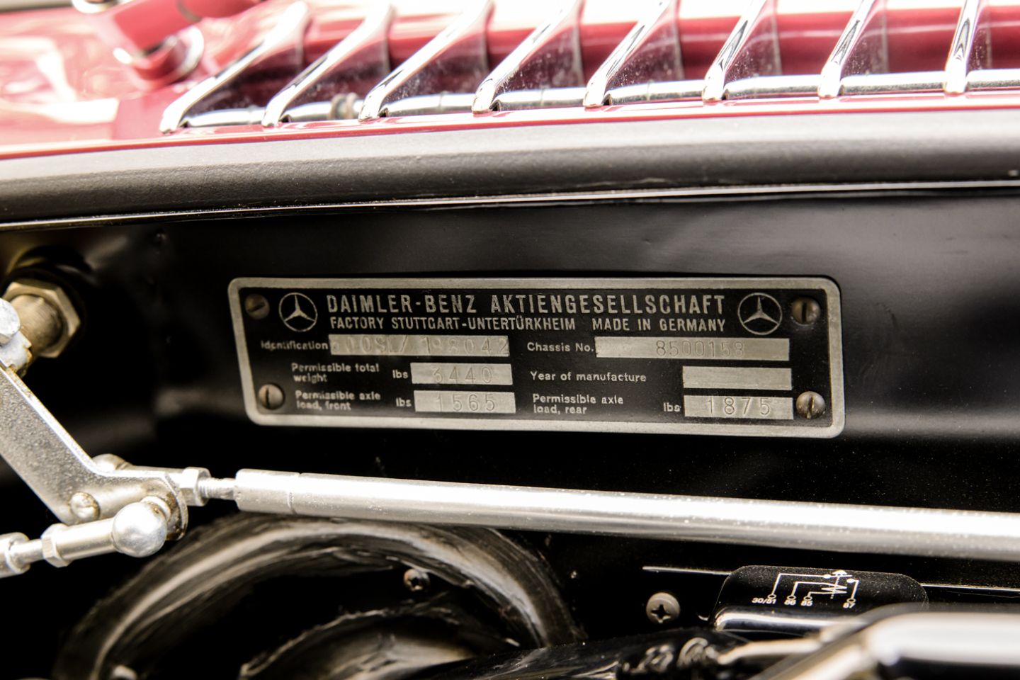 According to its factory issued data card, this 300SL Roadster was delivered from Mercedes-Benz at Stuttgart-Unterturkheim on December 17th, 1958 as a model year 1959 example, destined for importation into the United States. The Roadster was designated for delivery to Daimler-Benz of North America Rockefeller Center, New York, fitted with 4-wheel drum brakes and a cast iron engine. This 300SL was delivered new dressed in DB 190 graphite grey paint with a DB 180 silver grey metallic hard top and 1079 red leather upholstery with a 708 grey soft top delivered separately in a box. Further delivery specifications included instruments in English, sealed beam US headlights, a Becker Mexico radio and a 1:3.89 rear end ratio.