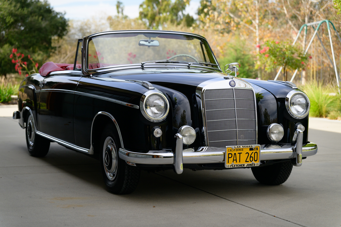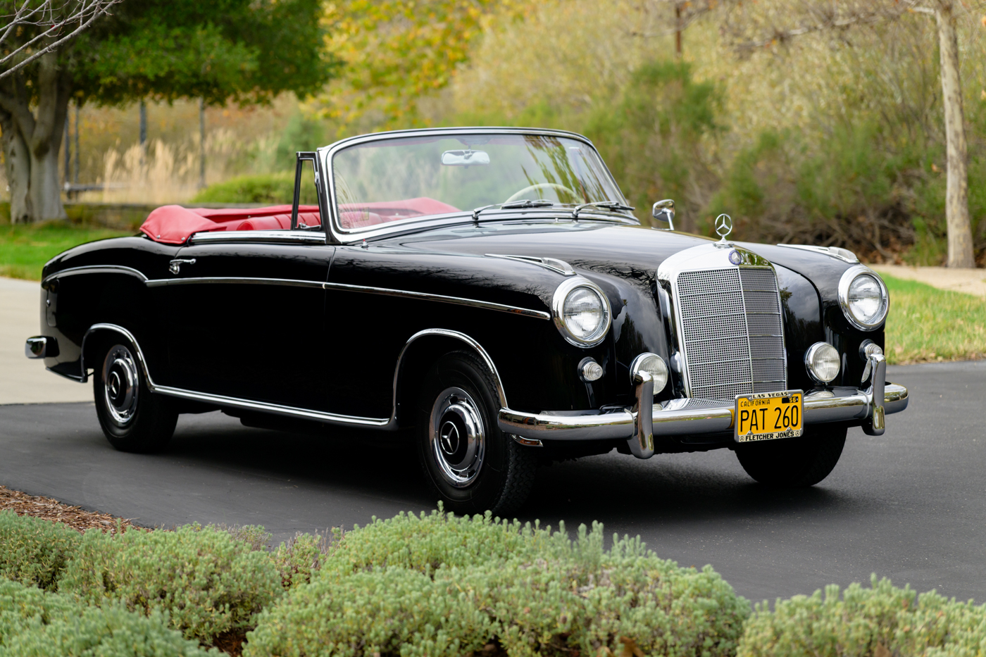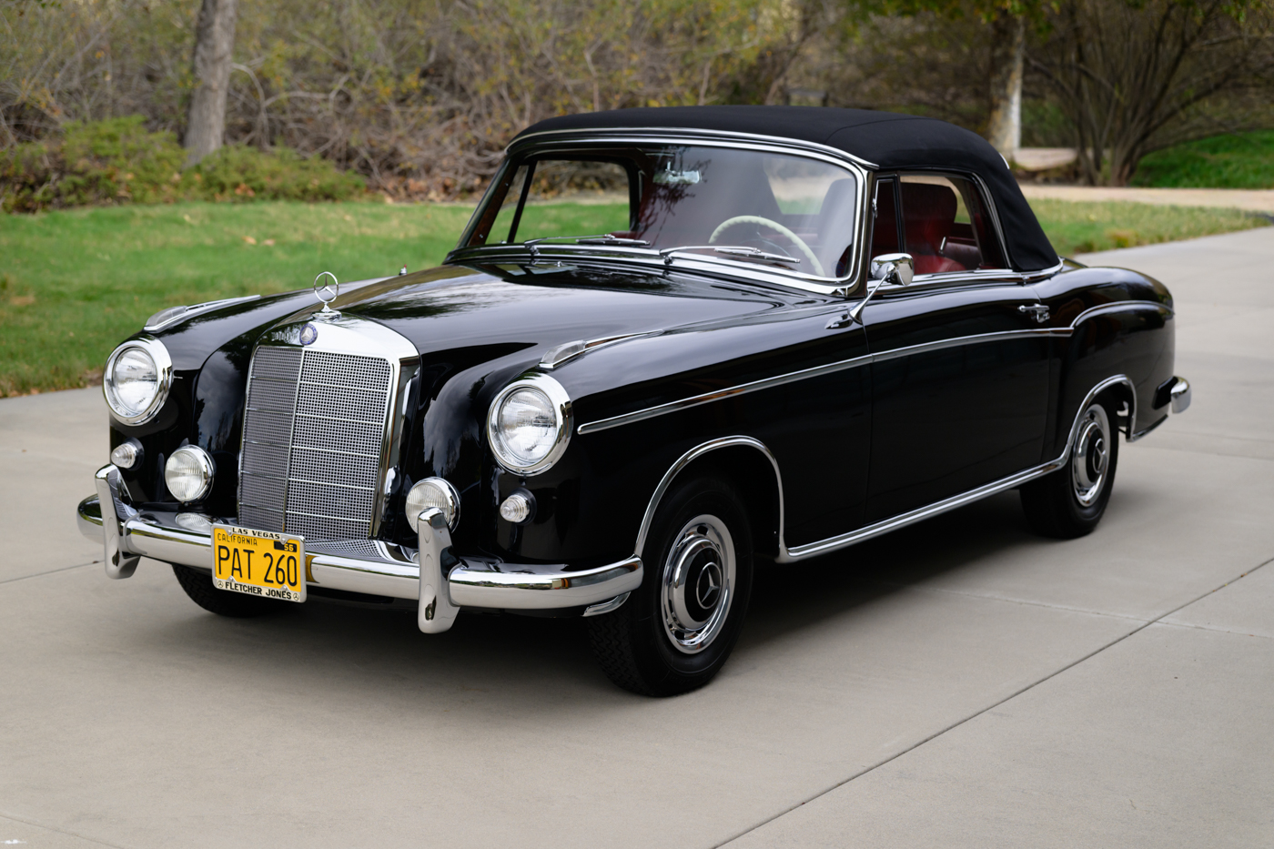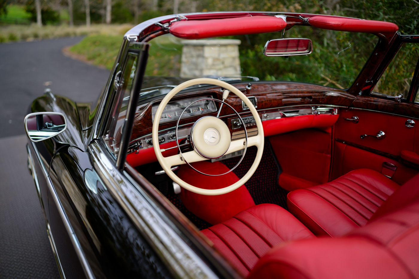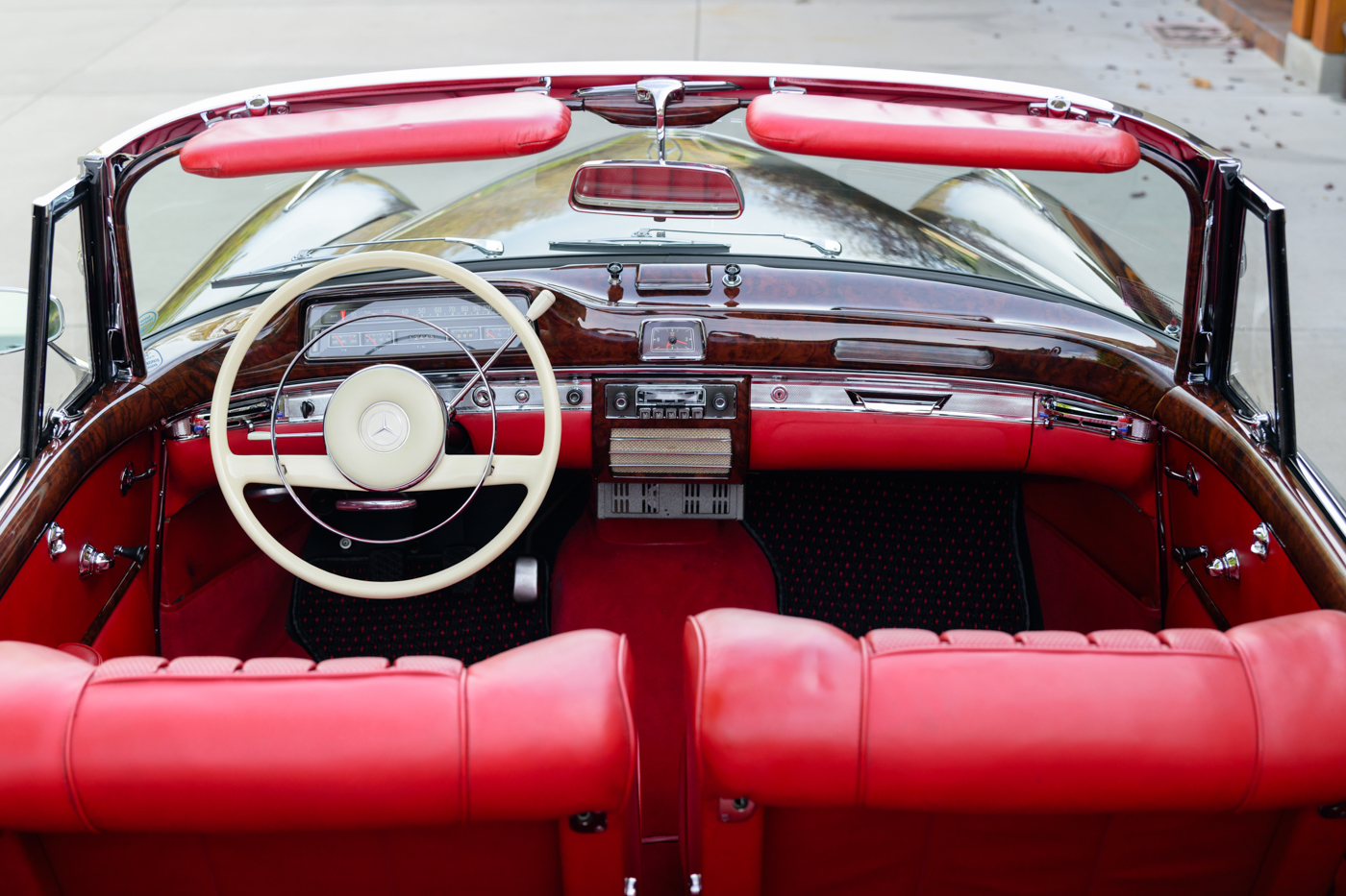Today, this rare, fuel-injected 220 SE Cabriolet presents extraordinarily well in its stunning black-on-red factory original color combination. The treatment and attention this Mercedes has seen since new is apparent at every turn as tribute to one of the three-pointed-star’s most elegant classic models. This beautiful 3 owner classic comes with all original books, both original factory data cards, original tools, fitted luggage, rare front seat headrests, original leather tonneau cover, MB tire pressure gauge, original jack and spare tire. A largely original, concours quality Mercedes-Benz event and show car in a stunning original color combination.
