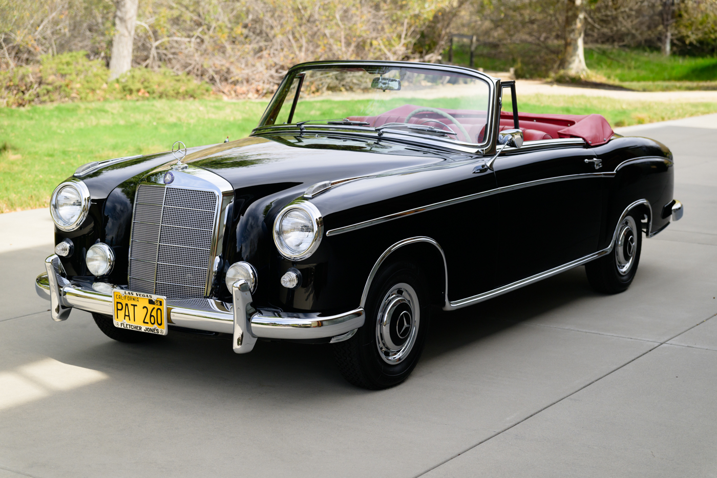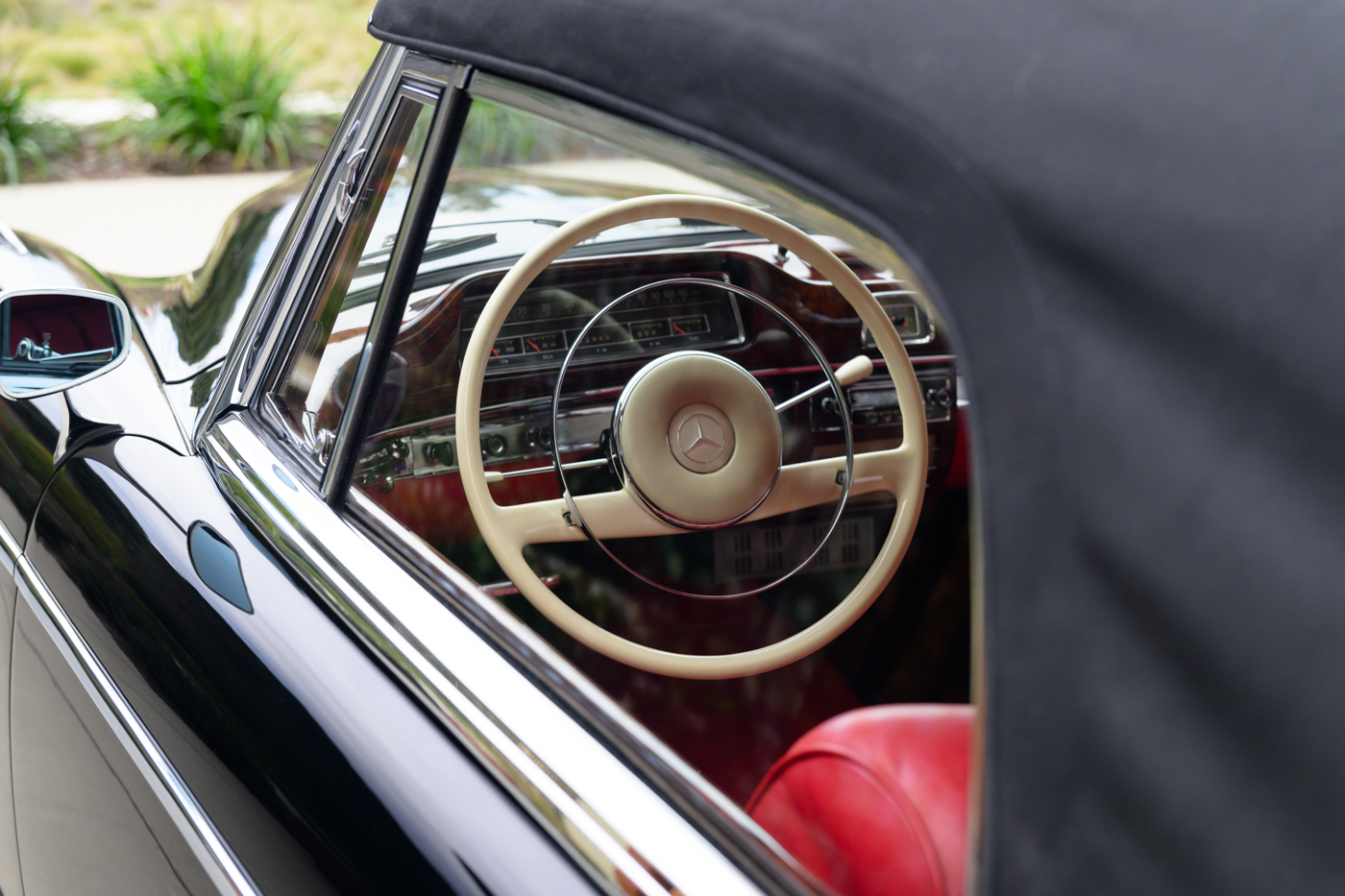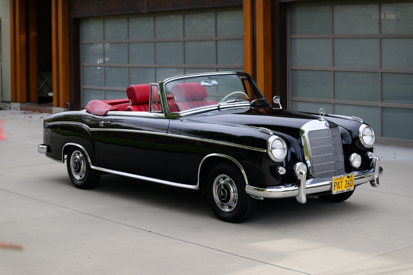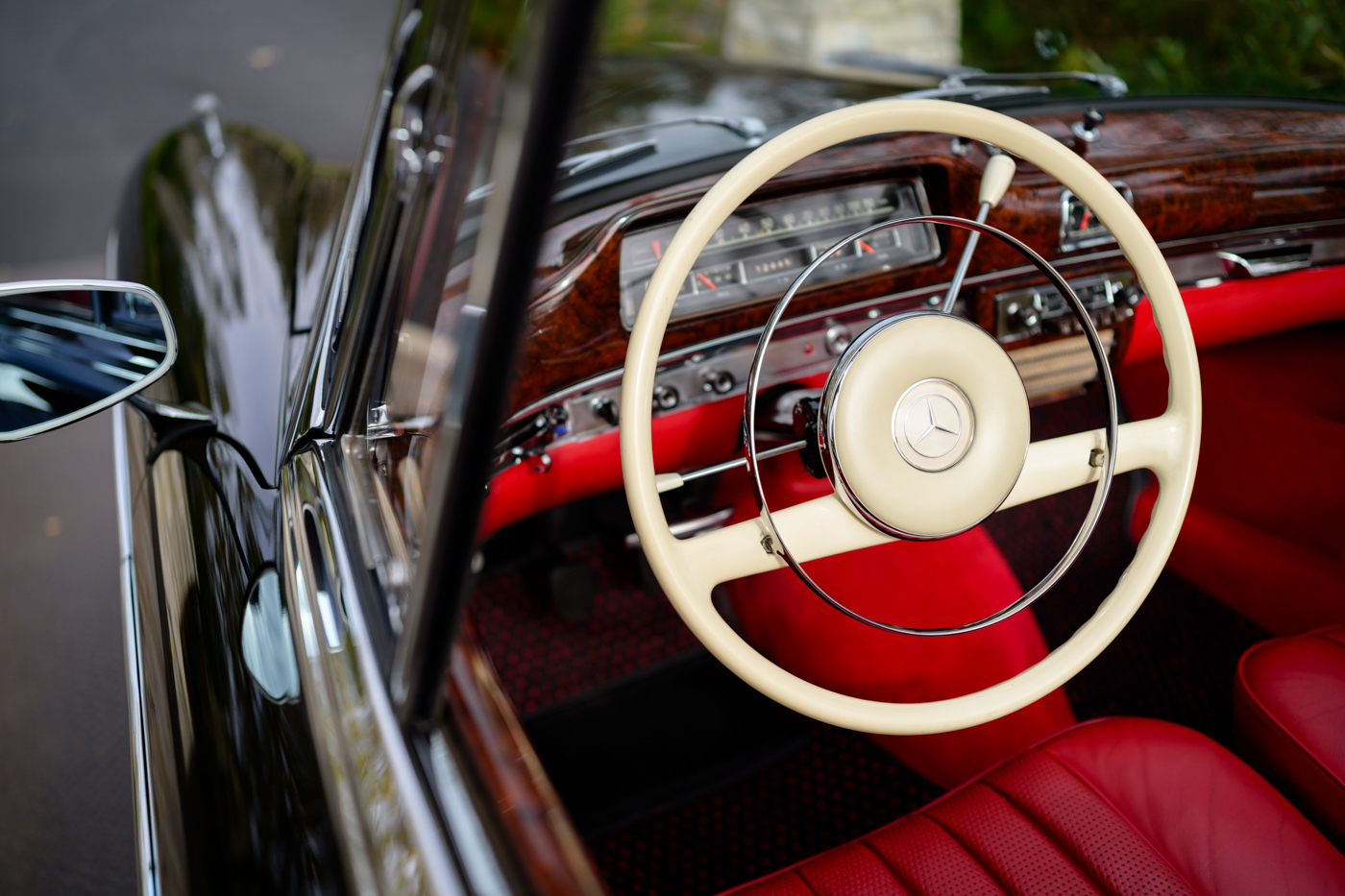 Today, this rare, fuel-injected 220 SE Cabriolet presents extraordinarily well in its stunning black-on-red factory original color combination. The treatment and attention this Mercedes has seen since new is apparent at every turn as tribute to one of the three-pointed-star’s most elegant classic models. This beautiful 3 owner classic comes with all original books, both original factory data cards, original tools, fitted luggage, rare front seat headrests, original leather tonneau cover, MB tire pressure gauge, original jack and spare tire. A largely original, concours quality Mercedes-Benz event and show car in a stunning original color combination.