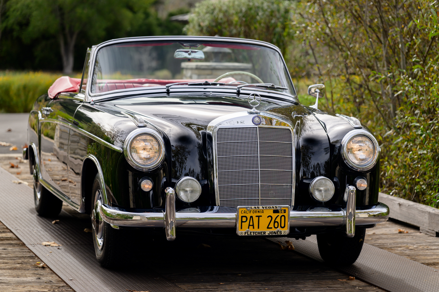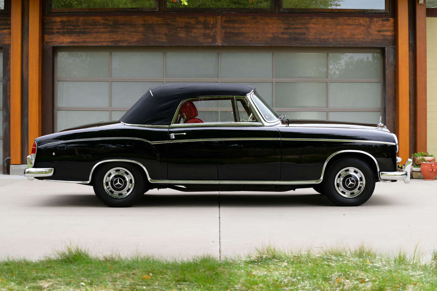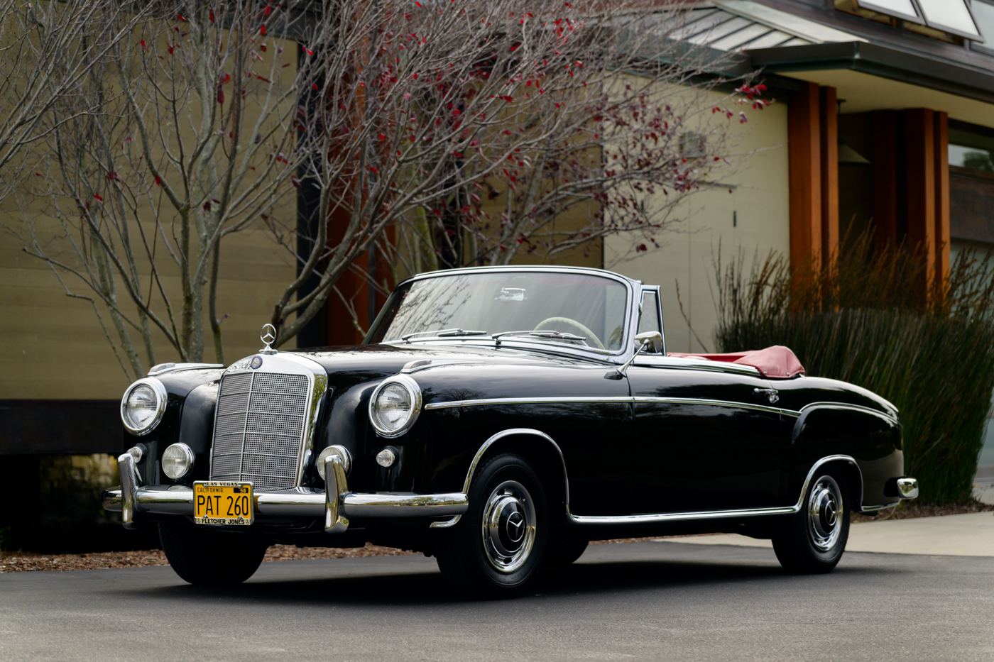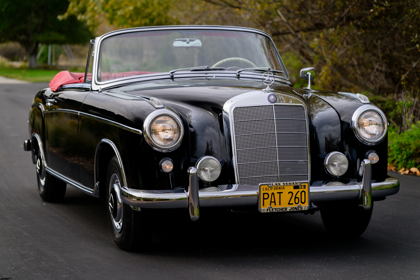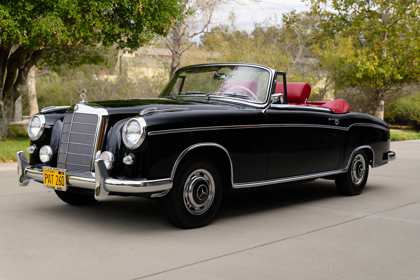 Today, this rare, fuel-injected 220 SE Cabriolet presents extraordinarily well in its stunning black-on-red factory original color combination. The treatment and attention this Mercedes has seen since new is apparent at every turn as tribute to one of the three-pointed-star’s most elegant classic models. This beautiful 3 owner classic comes with all original books, both original factory data cards, original tools, fitted luggage, rare front seat headrests, original leather tonneau cover, MB tire pressure gauge, original jack and spare tire. A largely original, concours quality Mercedes-Benz event and show car in a stunning original color combination.