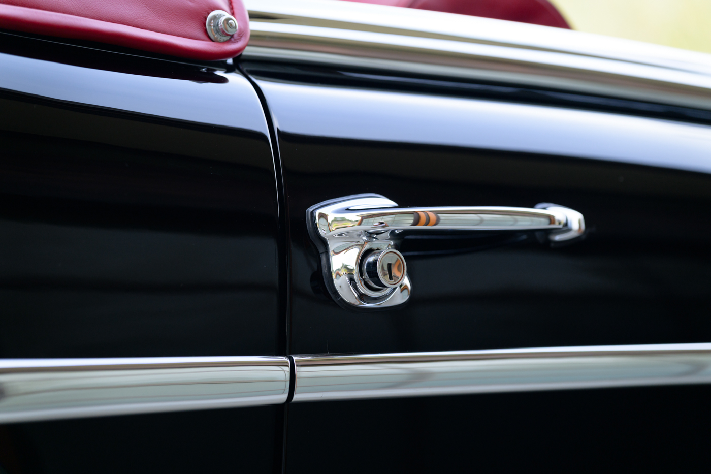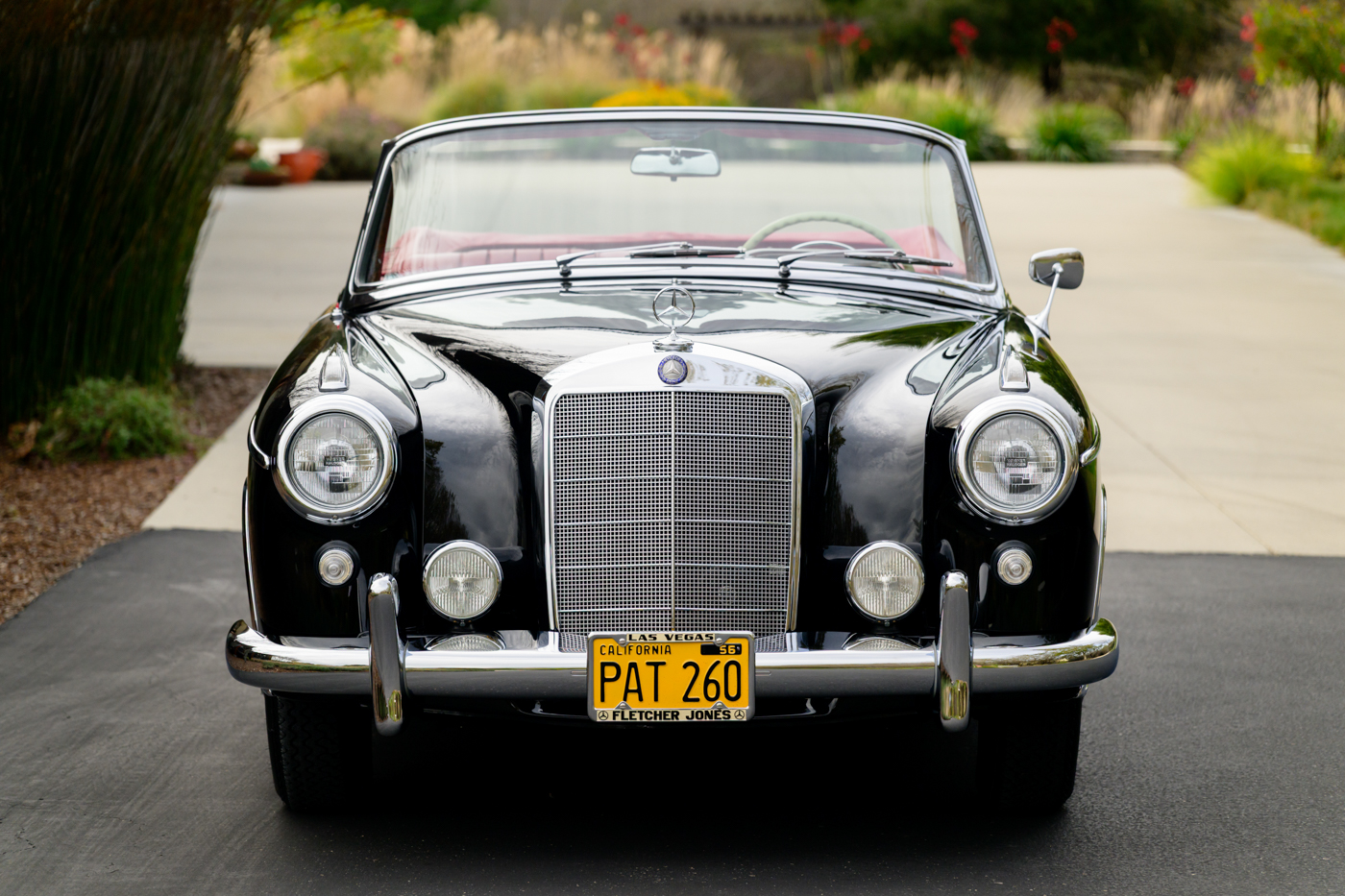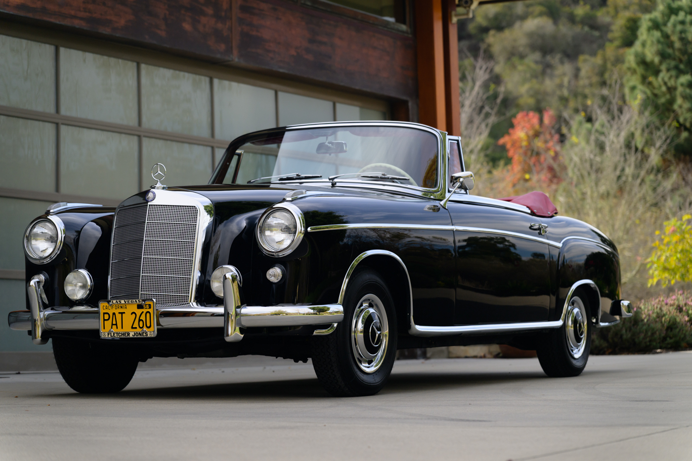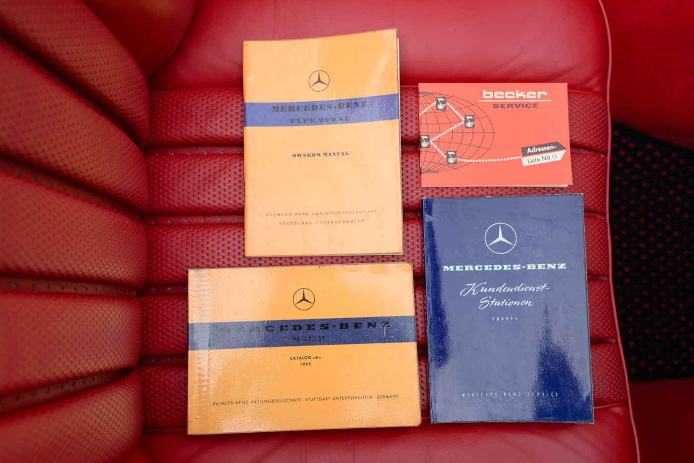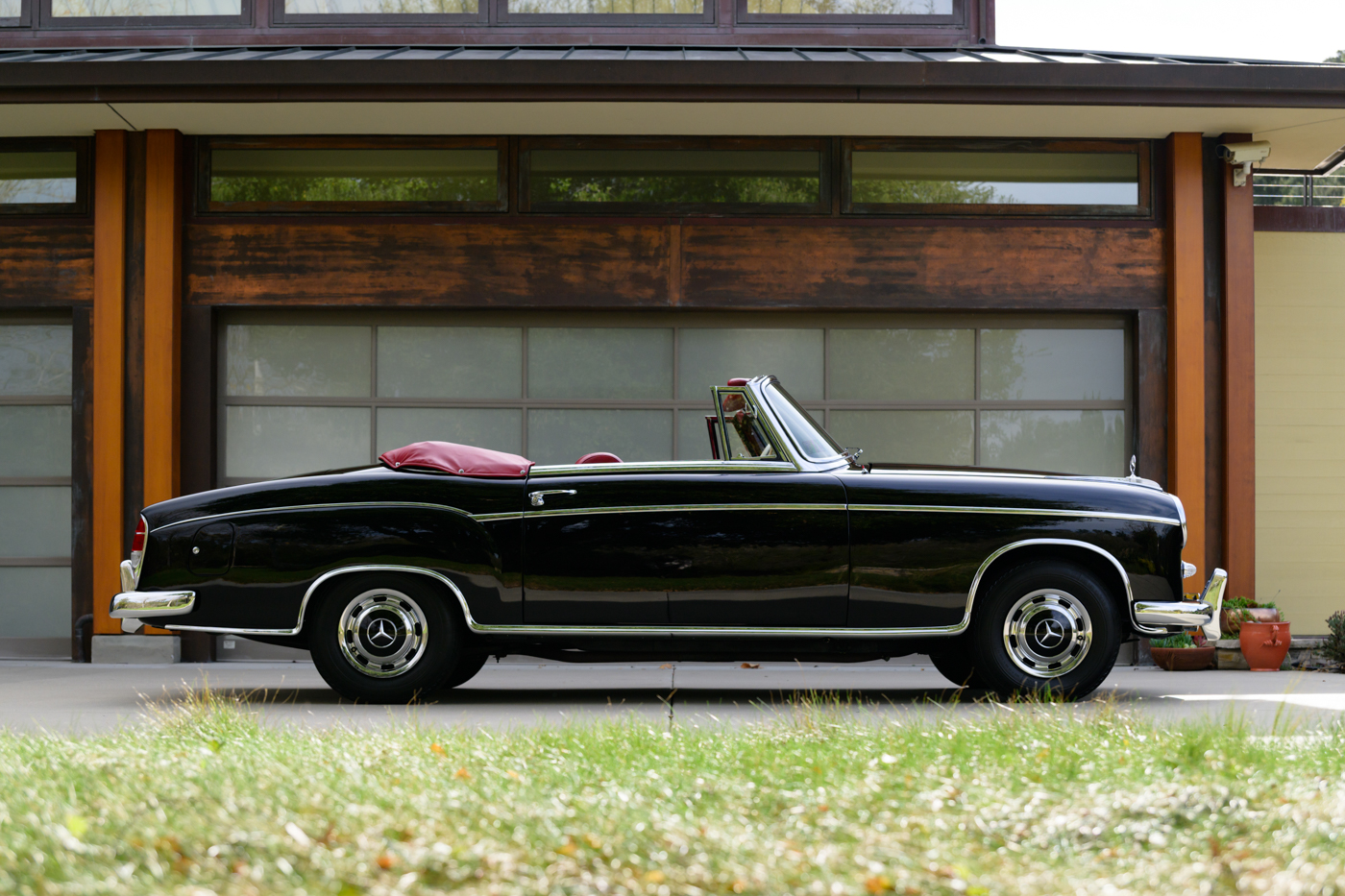 Today, this rare, fuel-injected 220 SE Cabriolet presents extraordinarily well in its stunning black-on-red factory original color combination. The treatment and attention this Mercedes has seen since new is apparent at every turn as tribute to one of the three-pointed-star’s most elegant classic models. This beautiful 3 owner classic comes with all original books, both original factory data cards, original tools, fitted luggage, rare front seat headrests, original leather tonneau cover, MB tire pressure gauge, original jack and spare tire. A largely original, concours quality Mercedes-Benz event and show car in a stunning original color combination.