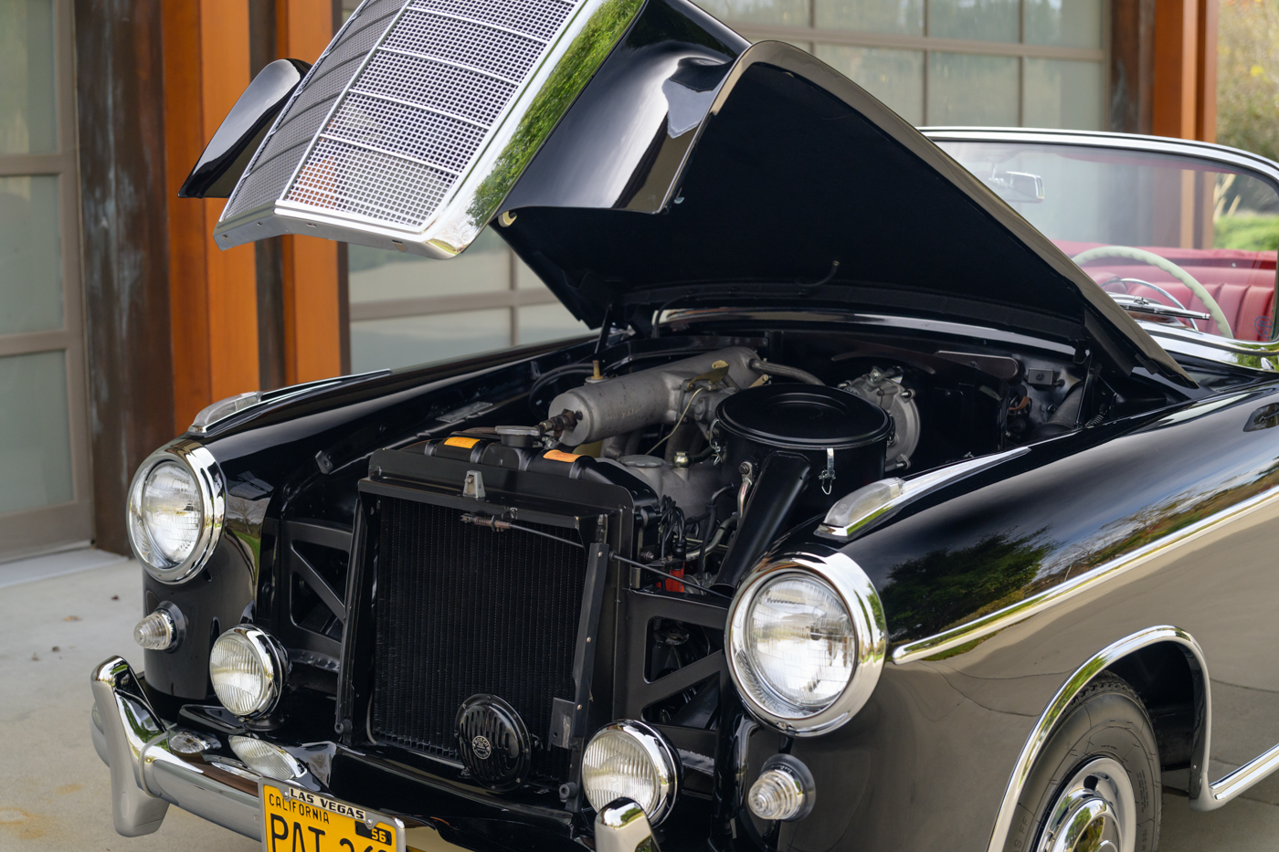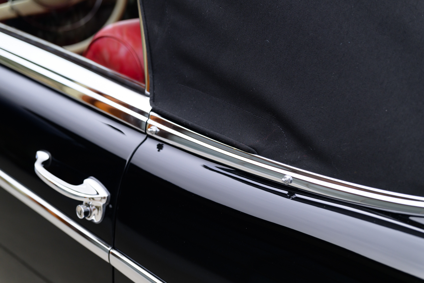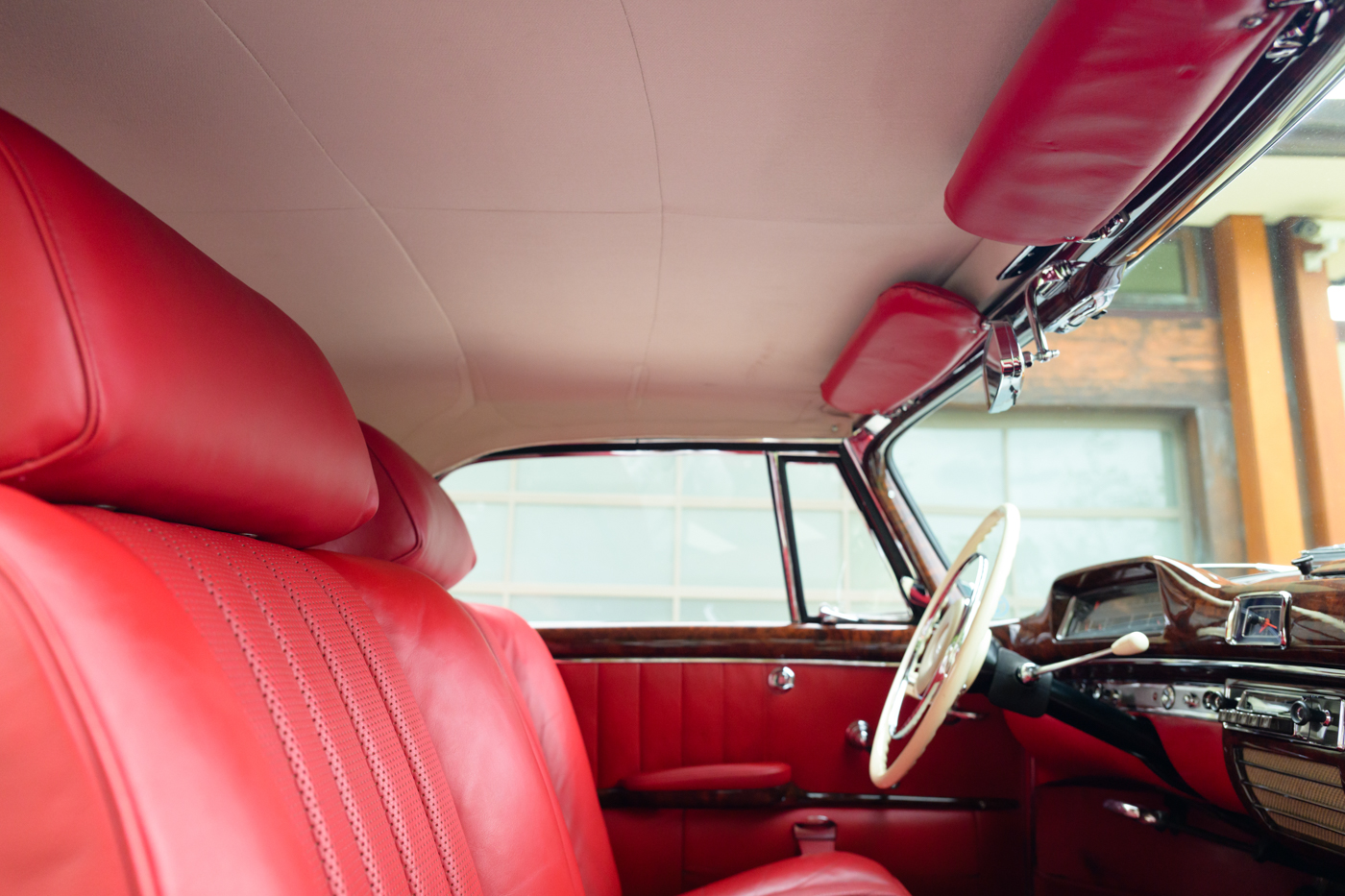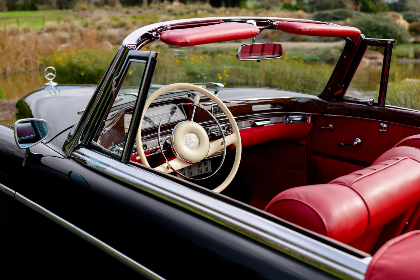 The 220 SE Cabriolet, with its easily retractable convertible soft top, is the most desirable of the three body styles built on the W128 chassis. In 1958, the 220 “Ponton” range of Mercedes-Benz was upgraded in limited numbers with a fuel-injected (Einspritzmotor) version of the 2.2-litre overhead-camshaft six cylinder engine. Maximum power of the SE model was increased beyond that of the more numerously produced and carbureted 220 S examples that came before it giving a noticeable improvement in acceleration that dropped the 0-100km/h speed by a full two seconds. The one-piece chassis and body (unibody), designed with collapsible components for safety in collisions, has a single clean styling trim-line from the headlamp along the front fender across the door panel that ends at the taillight at the end of the rear fender. These final Ponton SE’s were equipped with four wheel hydraulic drum brakes and were engineered with high end luxury buyers in mind, having been produced to precise standards for every day use if required.