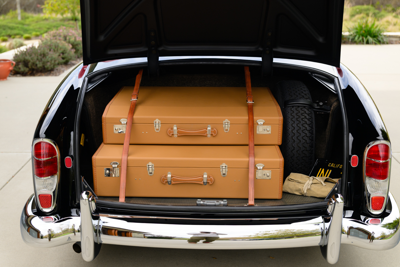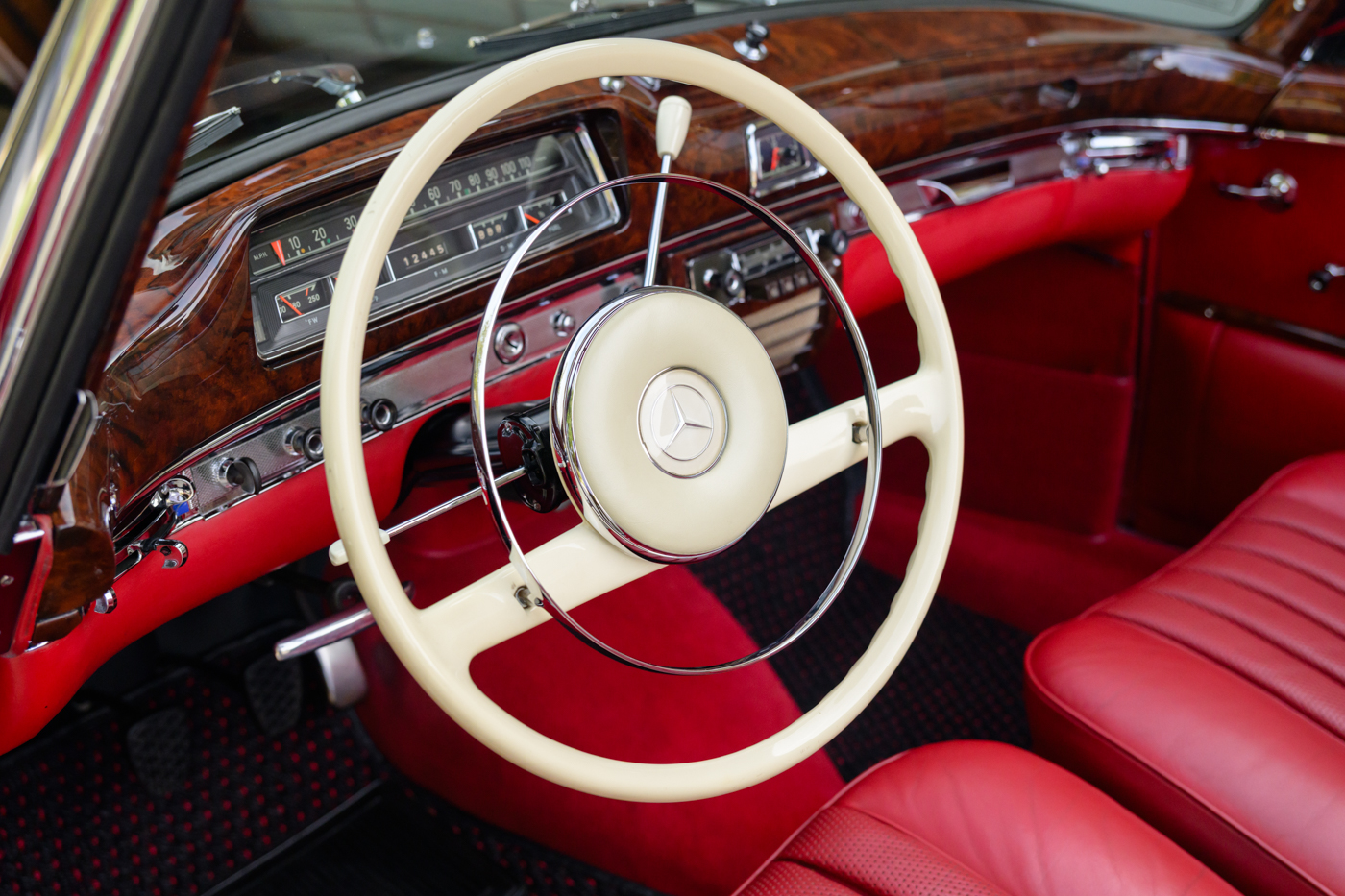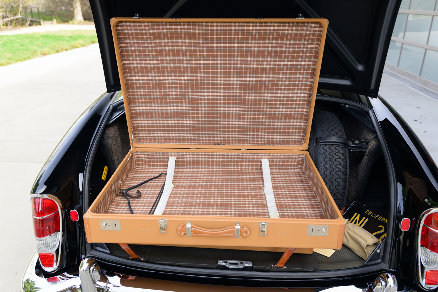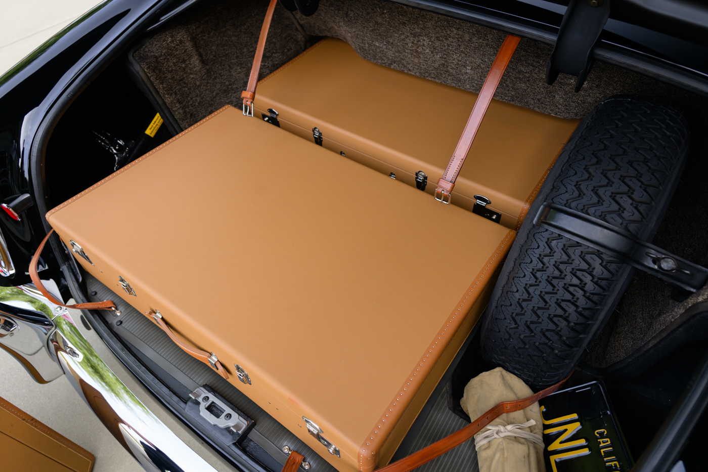 While in Dr. Lutfy’s ownership, this 220SE Cabriolet has undergone consistent maintenance and has been the beneficiary of climate controlled dry collection storage through to today. Of note, the original leather of the front seats speak to the believed to be original 12,328 miles on the odometer with minimal wear throughout, still remaining in supple condition for regular use. The front seats, door panel leather and arm rests in the rear seating area all remain original and are still in excellent condition adding a particularly pleasing sense of history to the experience of driving the car. The rear seating compartment leather has been restored while the armrests and side panel leather remains in beautiful original condition. The wood dash has been expertly redone under the Dr. Lutfy ownership by Madera Concepts of Santa Barbara, Ca and a new leather boot cover has been made to cover the convertible soft top while the top is down. The original boot cover comes with the car and is perfect for use at events as a display of the car’s unusual preservation qualities. In furtherance to the luxury afforded by this 220SE convertible, it also comes appropriately fitted with a three-piece set of tan fitted luggage for the trunk space.