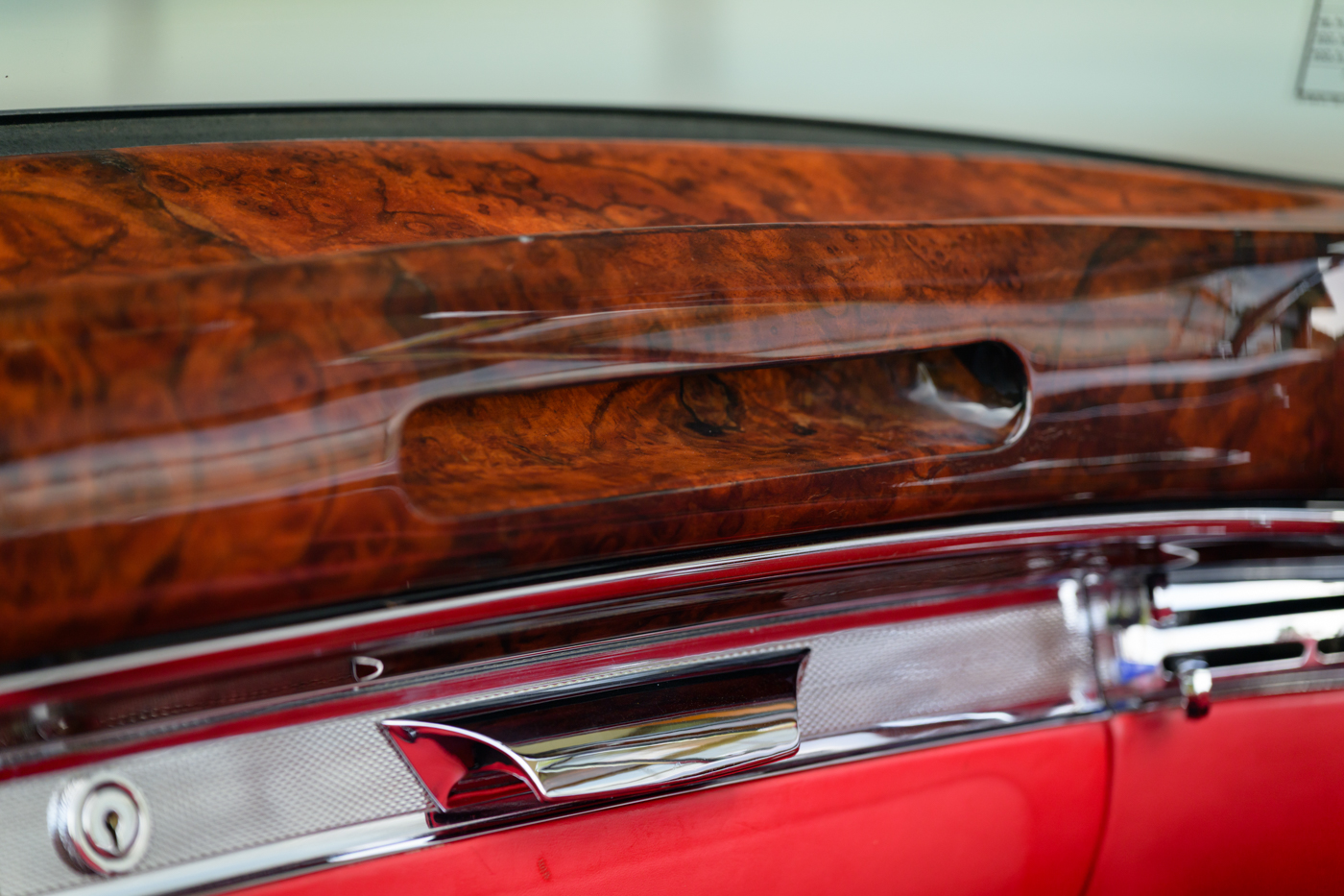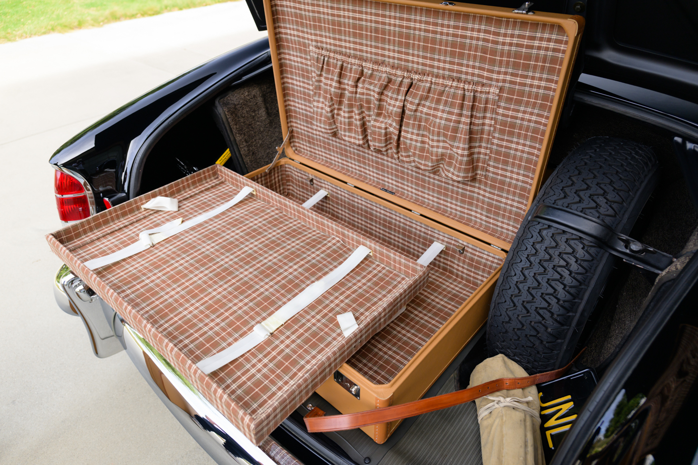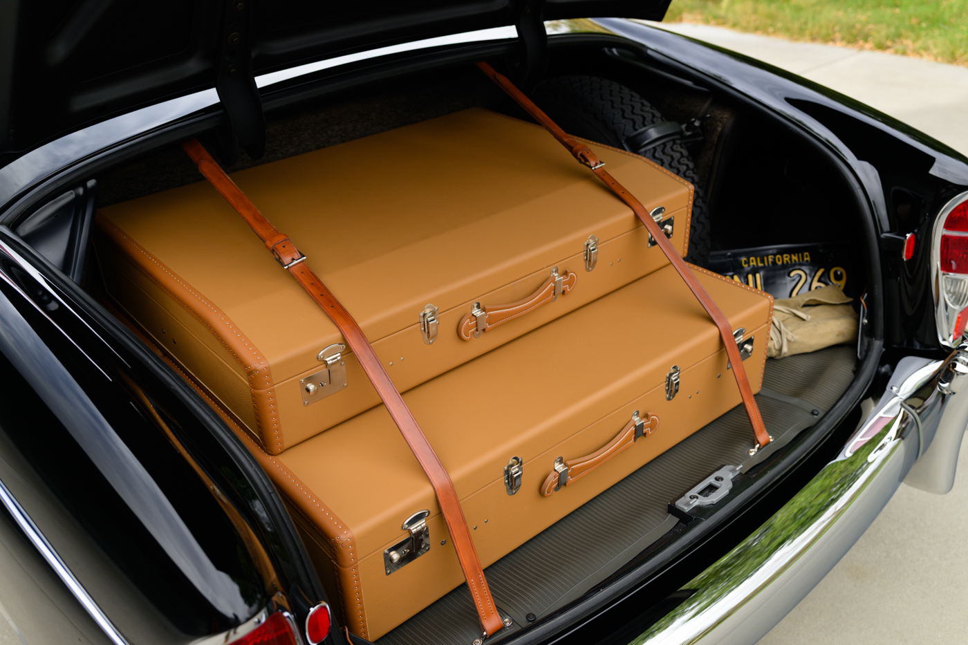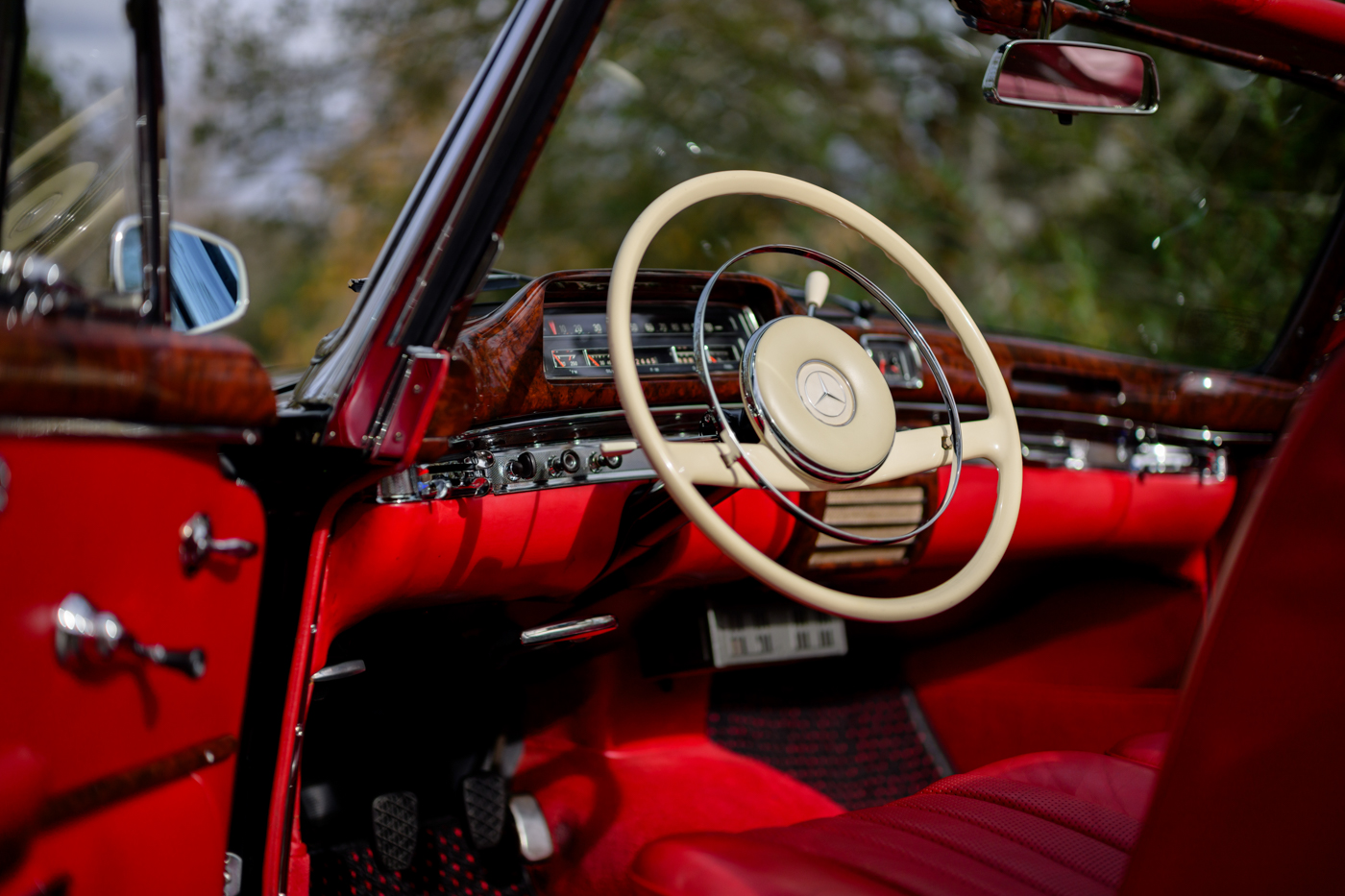 While in Dr. Lutfy’s ownership, this 220SE Cabriolet has undergone consistent maintenance and has been the beneficiary of climate controlled dry collection storage through to today. Of note, the original leather of the front seats speak to the believed to be original 12,328 miles on the odometer with minimal wear throughout, still remaining in supple condition for regular use. The front seats, door panel leather and arm rests in the rear seating area all remain original and are still in excellent condition adding a particularly pleasing sense of history to the experience of driving the car. The rear seating compartment leather has been restored while the armrests and side panel leather remains in beautiful original condition. The wood dash has been expertly redone under the Dr. Lutfy ownership by Madera Concepts of Santa Barbara, Ca and a new leather boot cover has been made to cover the convertible soft top while the top is down. The original boot cover comes with the car and is perfect for use at events as a display of the car’s unusual preservation qualities. In furtherance to the luxury afforded by this 220SE convertible, it also comes appropriately fitted with a three-piece set of tan fitted luggage for the trunk space.