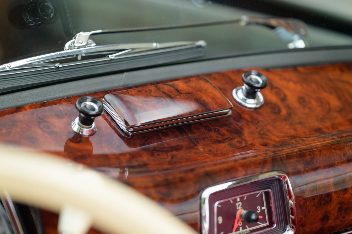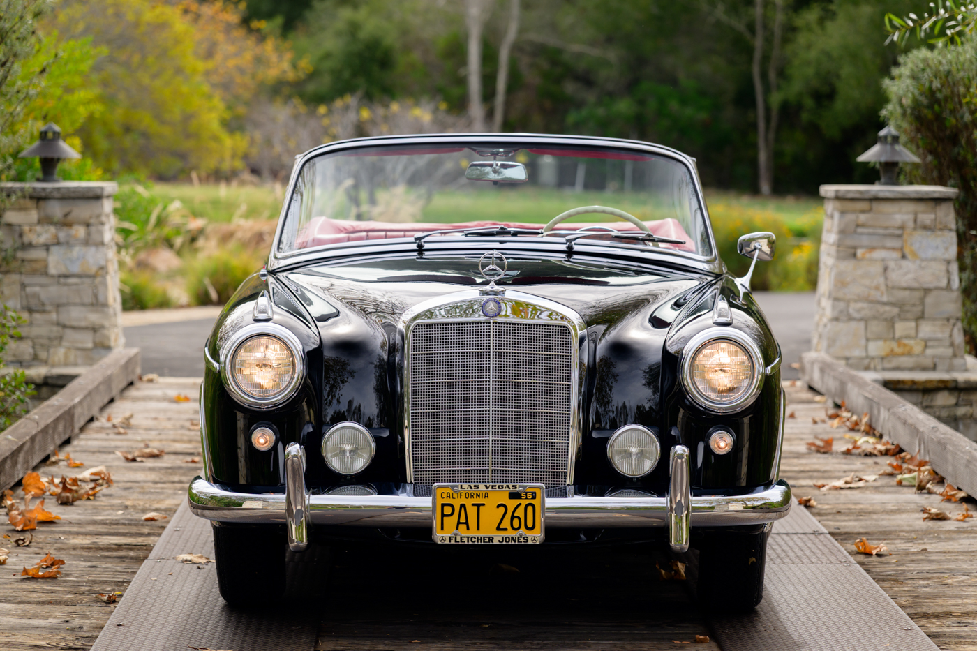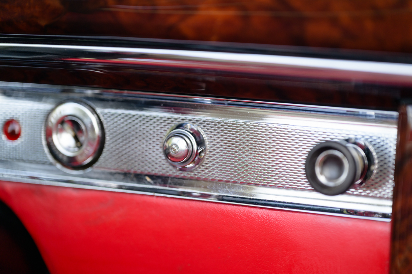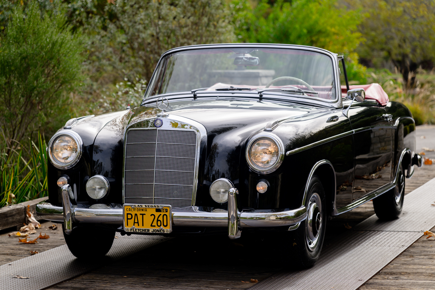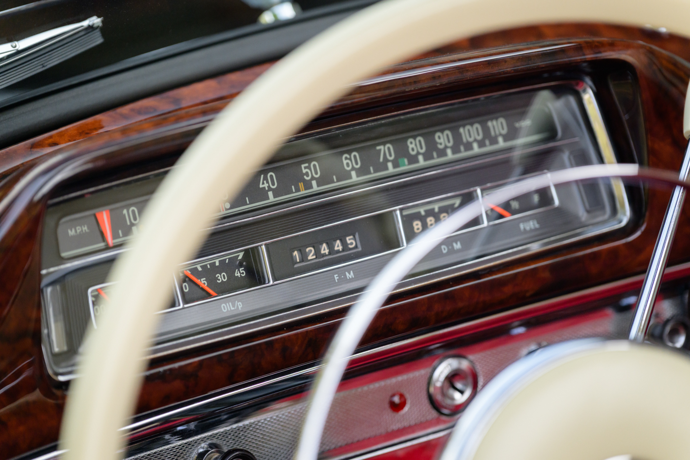 While in Dr. Lutfy’s ownership, this 220SE Cabriolet has undergone consistent maintenance and has been the beneficiary of climate controlled dry collection storage through to today. Of note, the original leather of the front seats speak to the believed to be original 12,328 miles on the odometer with minimal wear throughout, still remaining in supple condition for regular use. The front seats, door panel leather and arm rests in the rear seating area all remain original and are still in excellent condition adding a particularly pleasing sense of history to the experience of driving the car. The rear seating compartment leather has been restored while the armrests and side panel leather remains in beautiful original condition. The wood dash has been expertly redone under the Dr. Lutfy ownership by Madera Concepts of Santa Barbara, Ca and a new leather boot cover has been made to cover the convertible soft top while the top is down. The original boot cover comes with the car and is perfect for use at events as a display of the car’s unusual preservation qualities. In furtherance to the luxury afforded by this 220SE convertible, it also comes appropriately fitted with a three-piece set of tan fitted luggage for the trunk space.
